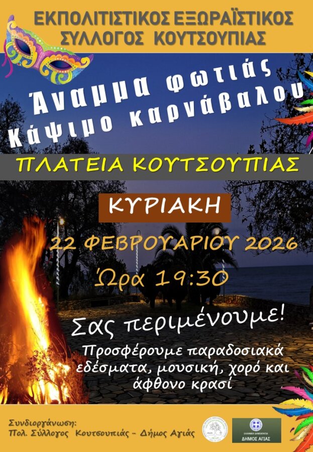 Ο Δήμος Αγιάς, η Κοινότητα Μελιβοίας, τα μέλη και οι φίλοι του Πολιτιστικού Συλλόγου Μελιβοίας “ΟΜΗΡΟΣ” συνδιοργανώνουν αποκριάτικες εκδηλώσεις στη…