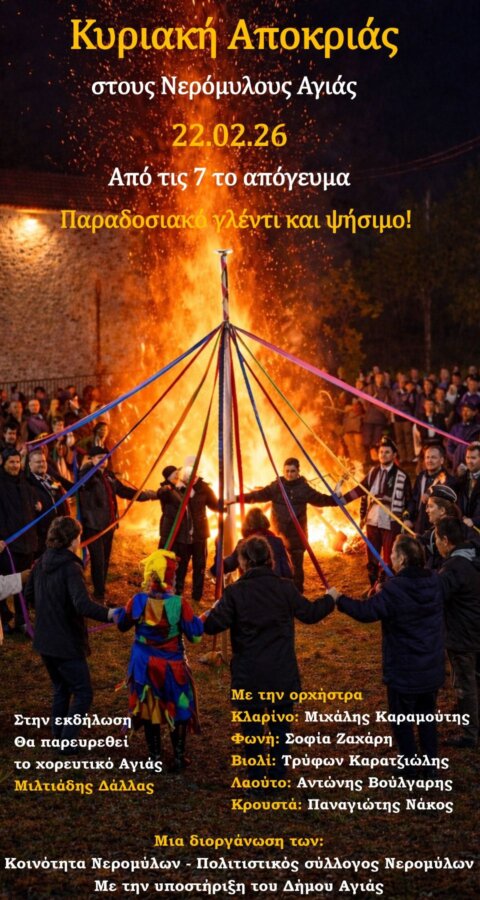 Η Κοινότητα Νερομύλων και ο Πολιτιστικός Σύλλογος Νερομύλων, με την υποστήριξη του Δήμου Αγιάς, διοργανώνουν παραδοσιακό γλέντι και ψήσιμο από…