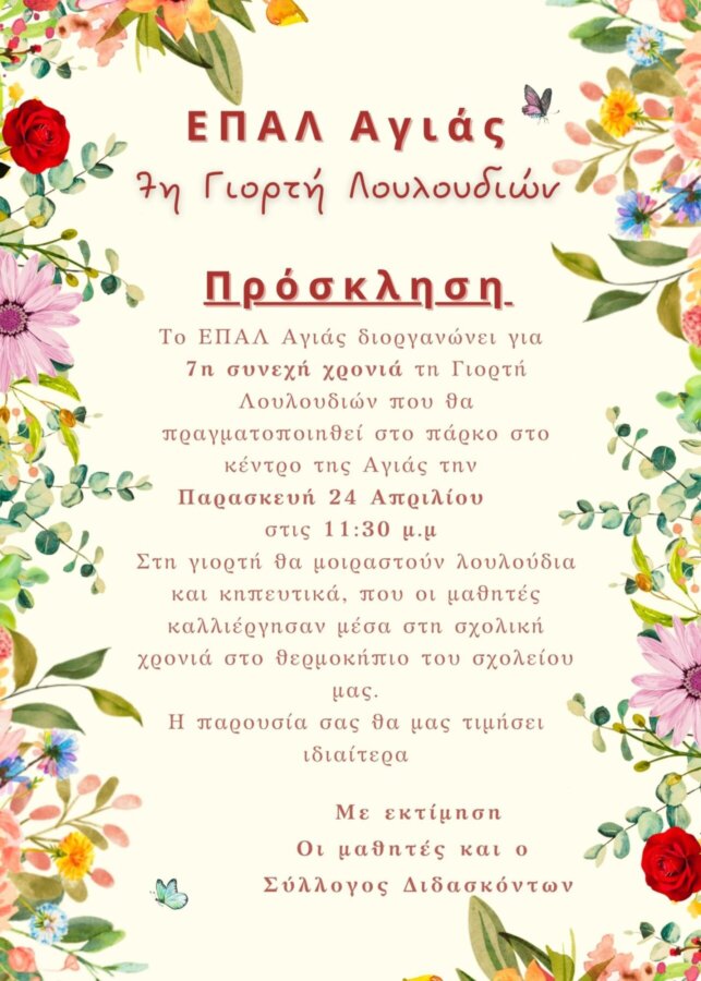 Ο Σύλλογος Γυναικών Ποταμιάς του Δήμου Αγιάς διοργανώνει την Τρίτη της Διακαινησίμου εβδομάδας, 14 Απριλίου, στις…