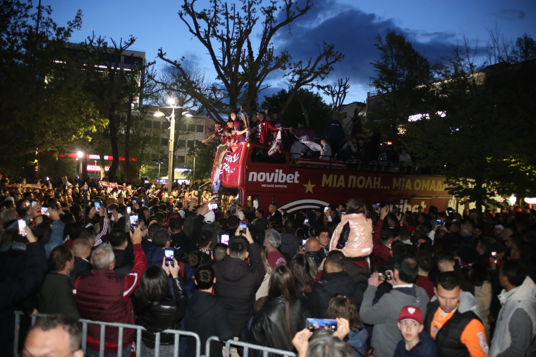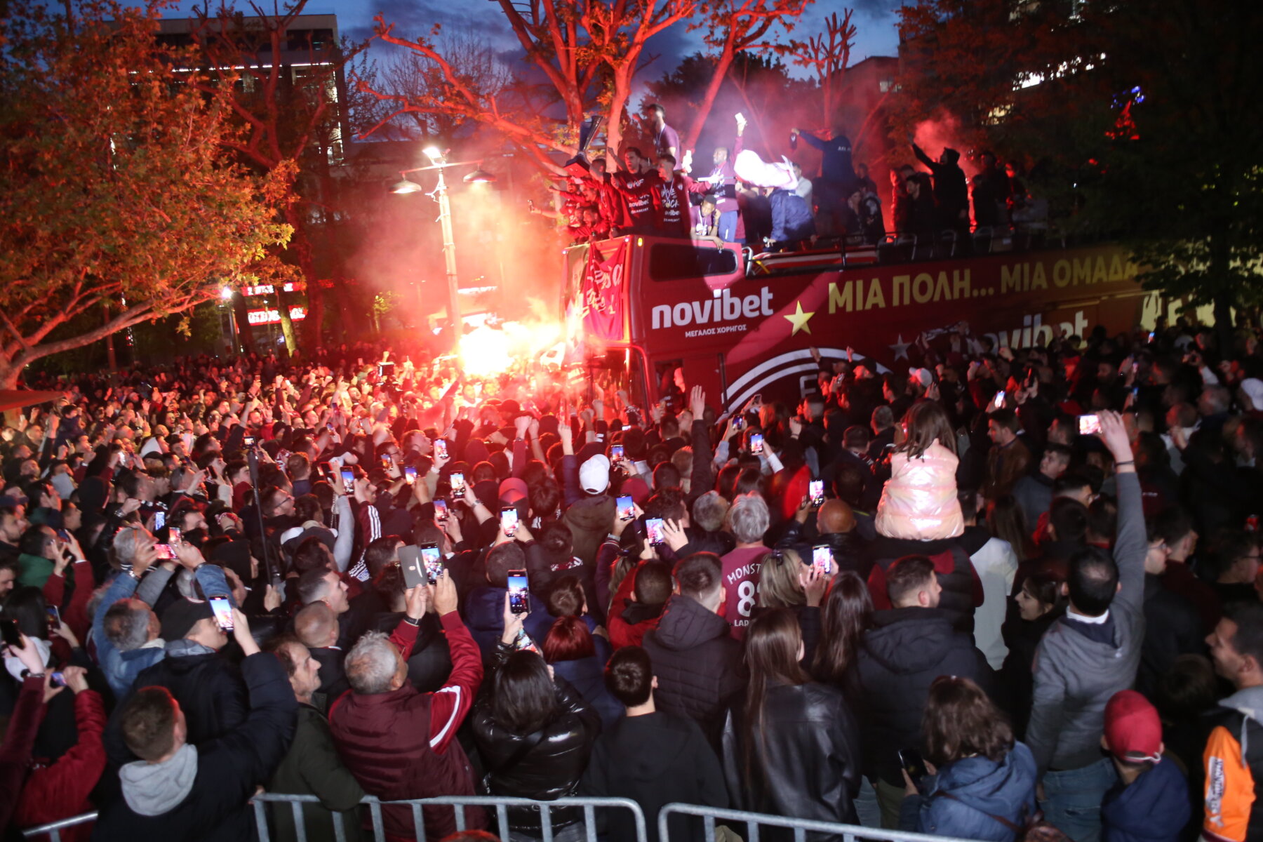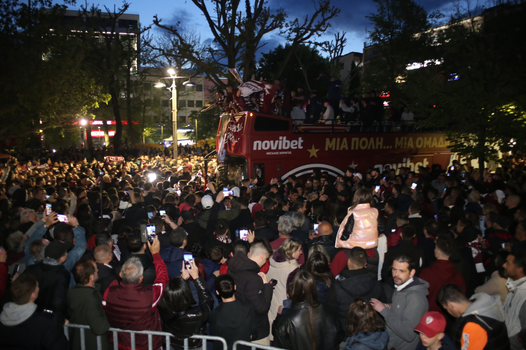 Το ανοικτό λεωφορείο που μετέφερε τους «βυσσινί», συνοδευόμενο από εκατοντάδες μοτοσικλέτες και αυτοκίνητα, διέσχισε τη διαδρομή από το γήπεδο στην κεντρική πλατεία της πόλης, όπου χιλιάδες κόσμου έστησαν μία μεγάλη φιέστα πανηγυρίζοντας την μεγάλη επιτυχία.