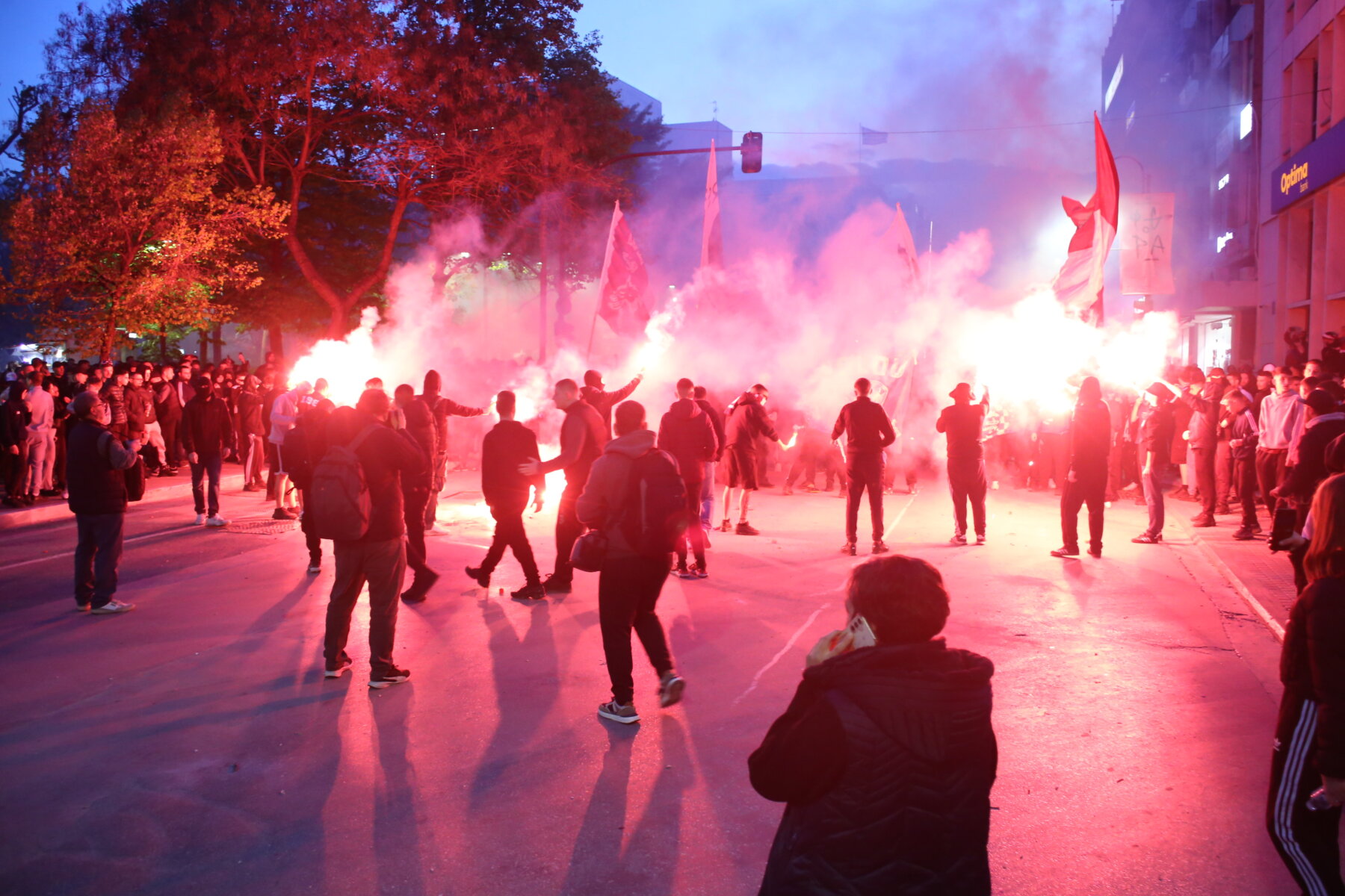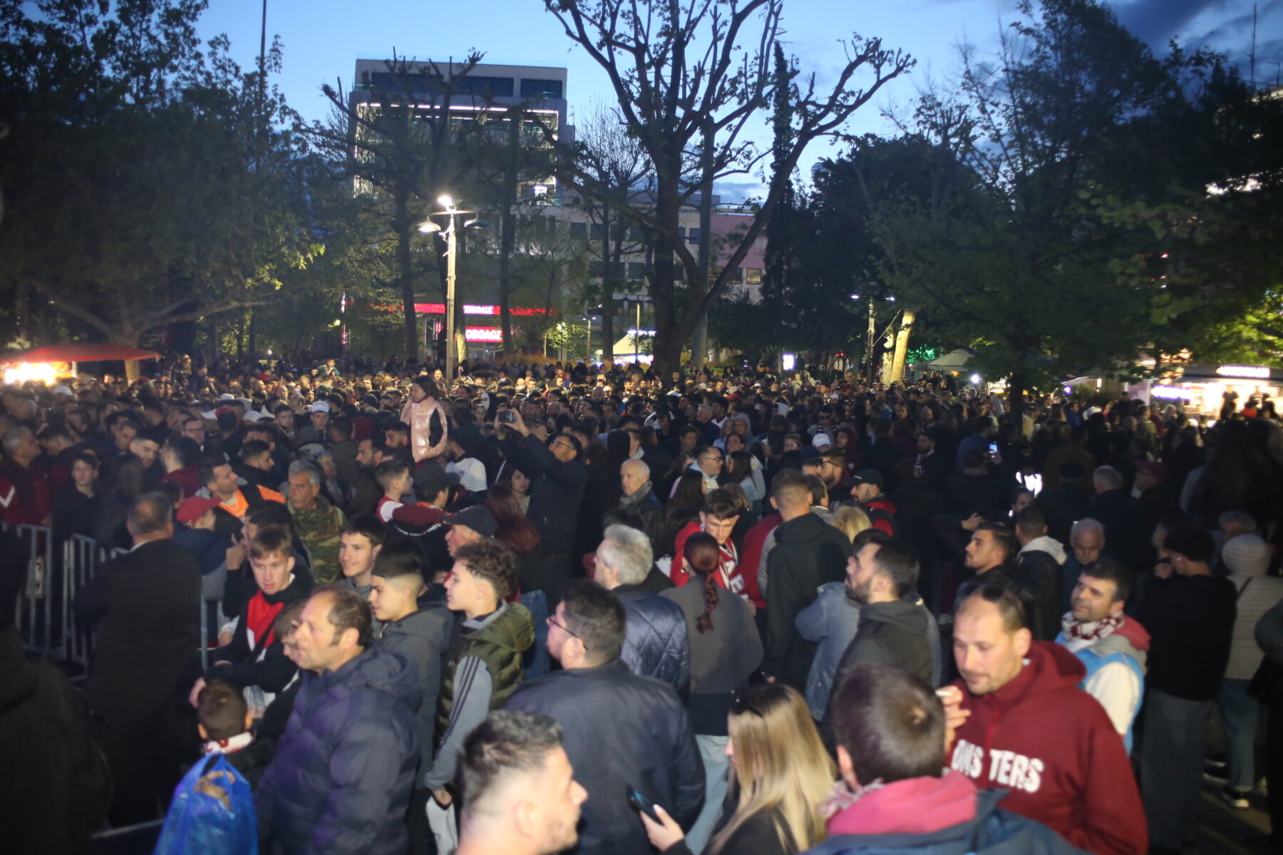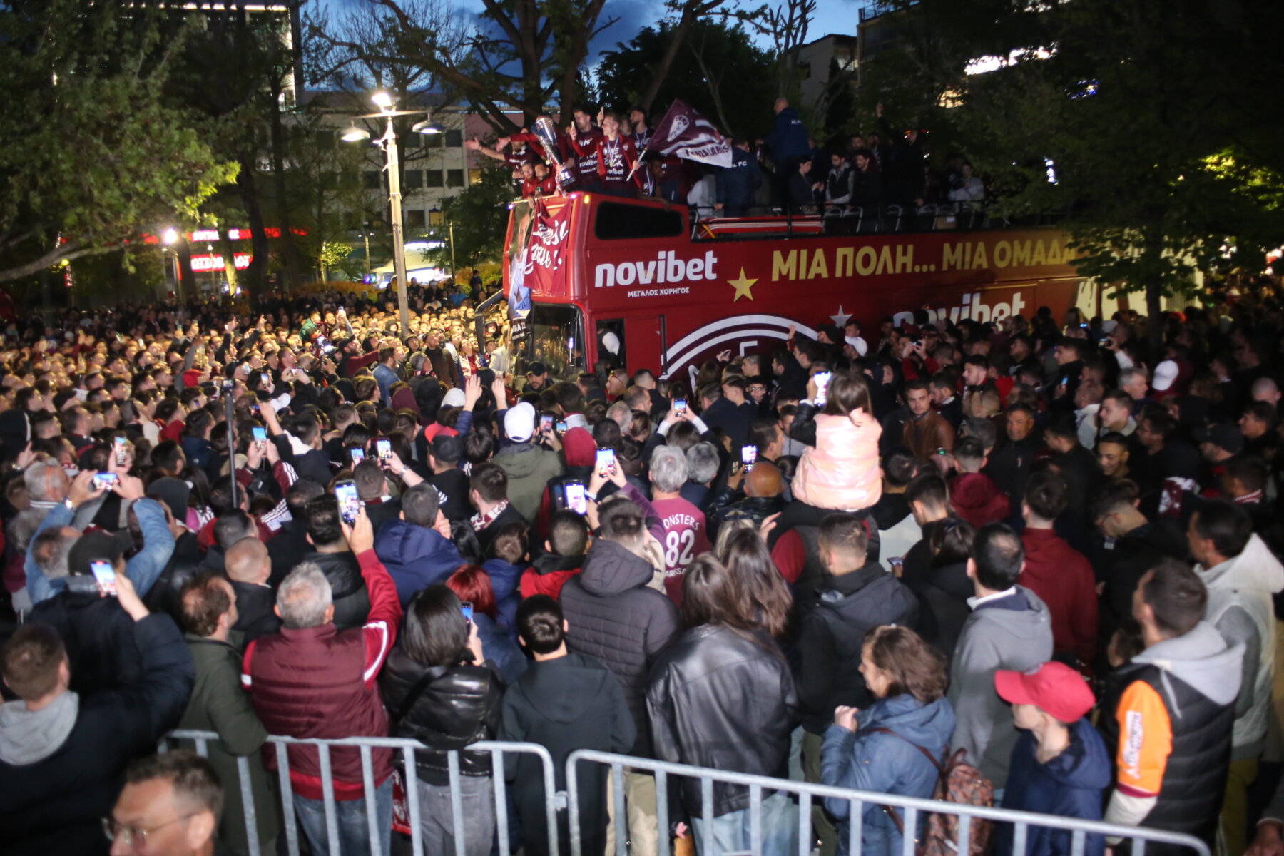 Το ανοικτό λεωφορείο που μετέφερε τους «βυσσινί», συνοδευόμενο από εκατοντάδες μοτοσικλέτες και αυτοκίνητα, διέσχισε τη διαδρομή από το γήπεδο στην κεντρική πλατεία της πόλης, όπου χιλιάδες κόσμου έστησαν μία μεγάλη φιέστα πανηγυρίζοντας την μεγάλη επιτυχία.