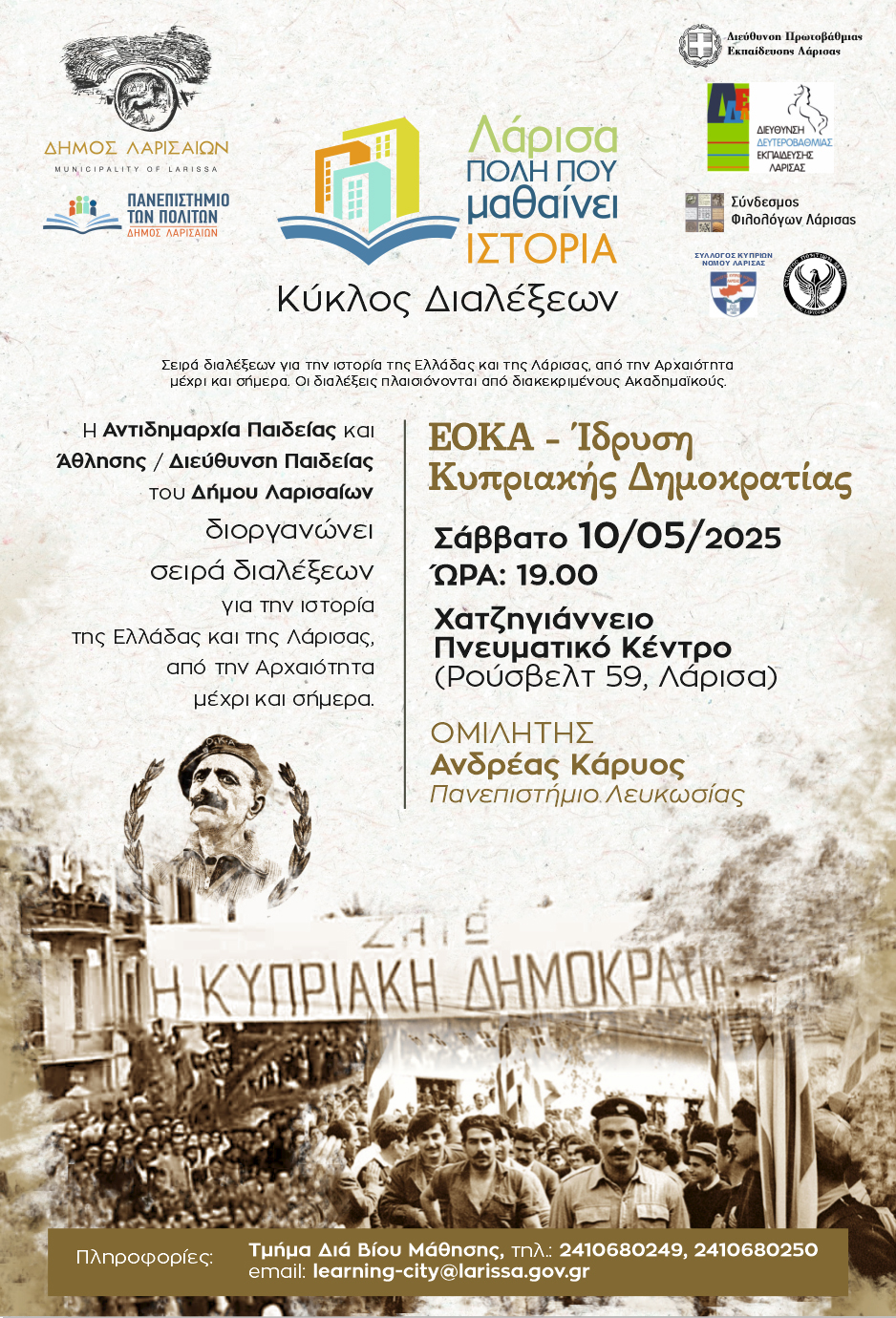 Συνεχίζεται με ιδιαίτερο ενδιαφέρον ο κύκλος διαλέξεων “Ιστορία & Πολιτισμός της Ελλάδας”, που διοργανώνει η Αντιδημαρχία Παιδείας & Άθλησης του Δήμου Λαρισαίων στο πλαίσιο της δράσης «Λάρισα – Πόλη που Μαθαίνει» και του Πανεπιστημίου των Πολιτών, σε συνεργασία με την Πρωτοβάθμια και Δευτεροβάθμια Εκπαίδευση Λάρισας, τον Σύνδεσμο Φιλολόγων Λάρισας, τον Σύλλογο Κυπρίων Ν. Λάρισας και τον Σύλλογο Ποντίων Λάρισας.