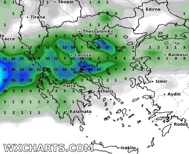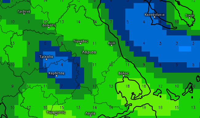 ΘΕΡΜΟΚΡΑΣΙΑ: Στα πεδινά των νομών Λάρισας, Τρικάλων και Καρδίτσας από 11 έως 18/20 βαθμούς κελσίου, στην Μαγνησία, τα παράλια και τις Σποράδες από 13 έως 19 βαθμούς κελσίου.