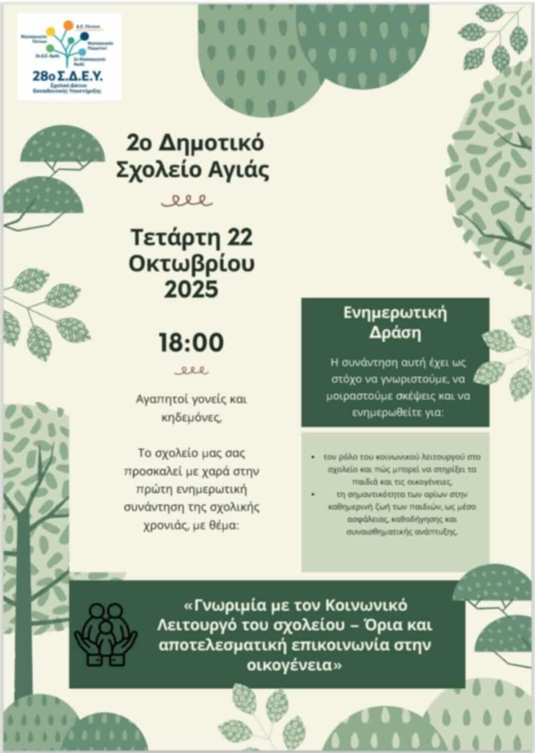 Η πρώτη ενημερωτική συνάντηση γονέων και κηδεμόνων της φετινής σχολικής χρονιάς για το 2ο Δημοτικό Σχολείο Αγιάς θα πραγματοποιηθεί την Τετάρτη 22 Οκτωβρίου, στις 6:00μμ, σε αίθουσα του σχολείου, και θα έχει ως θέμα της: “Γνωριμία με τον Κοινωνικό Λειτουργό του σχολείου – Όρια και αποτελεσματική επικοινωνία στην οικογένεια”.