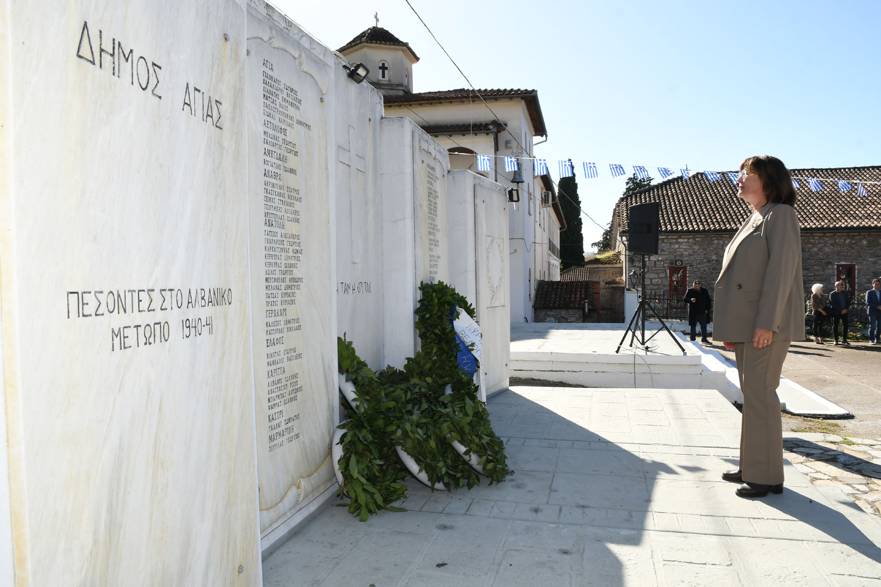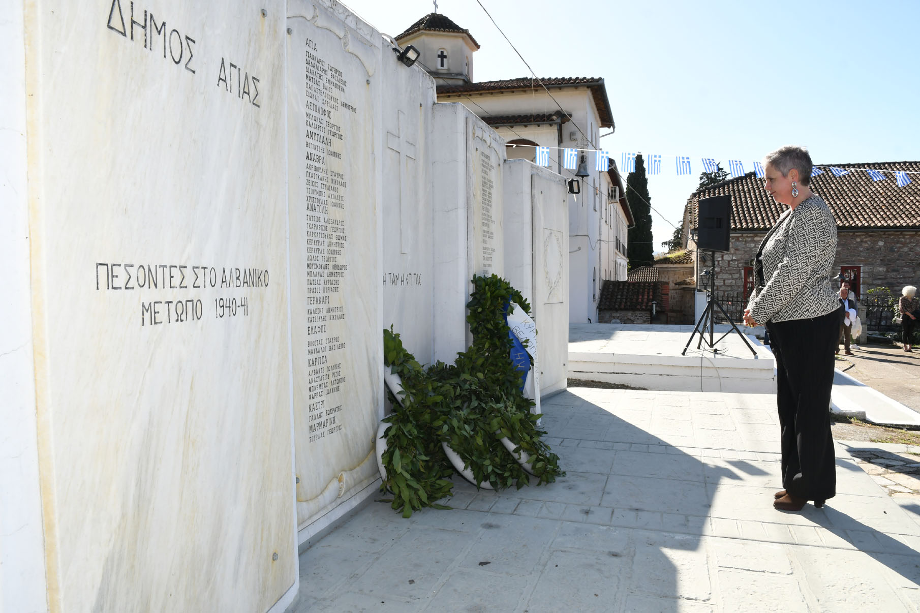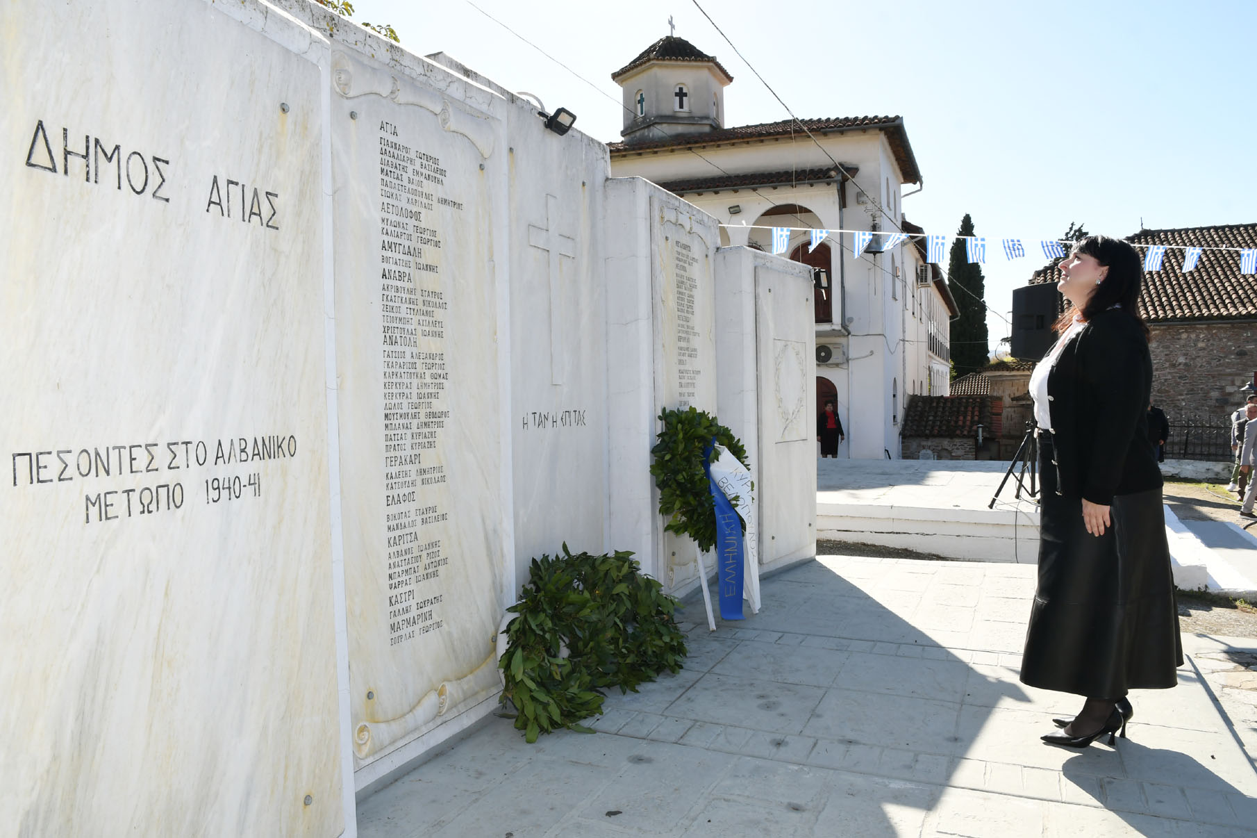 Ακολούθησε η εκφώνηση του πανηγυρικού της ημέρας από την διευθύντρια του 1ου Δημοτικού Σχολείου Αγιάς κ. Άννα Βαρνά, και στη συνέχεια εψάλη επιμνημόσυνη δέηση στο Μνημείο των Πεσόντων Αγωνιστών, κρατήθηκε ενός λεπτού σιγή, ακούστηκε ο Εθνικός μας Ύμνος, και κατατέθηκαν στεφάνια από τον αντιπεριφερειάρχη Αθλητισμού και Πολιτισμού, Σωτήρη Σουλούκο, εκπροσωπώντας την Περιφέρεια Θεσσαλίας, από τον δήμαρχο Αγιάς, Αντώνη Γκουντάρα, από την κ. Χριστίνα Κοντογιάννη εκ μέρους του κόμματος «Ελληνική Λύση», από την κ. Παρασκευή Νάκου εκ μέρους του κόμματος «Νίκη», Γραμματέα της Νομαρχιακής Κοινότητας Λάρισας, από τον εκπρόσωπο του Διοικητή Φρουράς ΑΤΑ, Επισμηναγό, Ιπτάμενο κ. Βασίλειο Κοντόπουλο εκ μέρους των Ενόπλων Δυνάμεων, από την Υποδιοικήτρια του Αστυνομικού Τμήματος Αγιάς, Υπαστυνόμο Α’ κ. Αρετή Κατωγιάννη, από τον Διοικητή του Πυροσβεστικού Κλιμακίου Αγιάς, Υποπυραγό κ. Χρήστο Καρνάβα, από τον Διοικητή του Λιμενικού Σταθμού Αγιοκάμπου, Πλωτάρχη κ. Χρήστο Αντωνίου, από τον τοπικό σύμβουλο της Δημοτικής Κοινότητας Αγιάς κ. Ζάχο Μπατζιόλα για την Εθνική Αντίσταση και τους Αναπήρους Πολέμου, από την διευθύντρια του 1ου Δημοτικού Σχολείου Αγιάς κ. Άννα Βαρνά εκ μέρους της σχολικής κοινότητας Πρωτοβάθμιας Εκπαίδευσης της περιοχής Αγιάς, από την κ. Βικτώρια Δημητρίου, διευθύντρια του Γενικού Λυκείου Αγιάς, εκ μέρους της Δευτεροβάθμιας Εκπαίδευσης, και από τον κ. Θεόδωρο Μαλαχτάρη εκ μέρους του Μορφωτικού Πολιτιστικού Συλλόγου Αγιωτών «Μιλτιάδης Δάλλας».