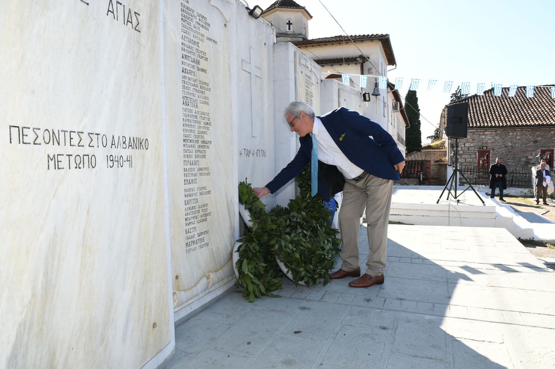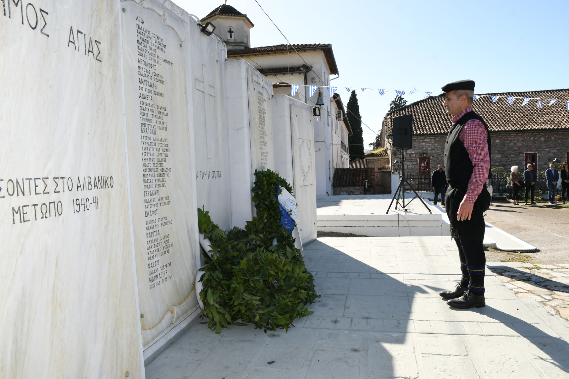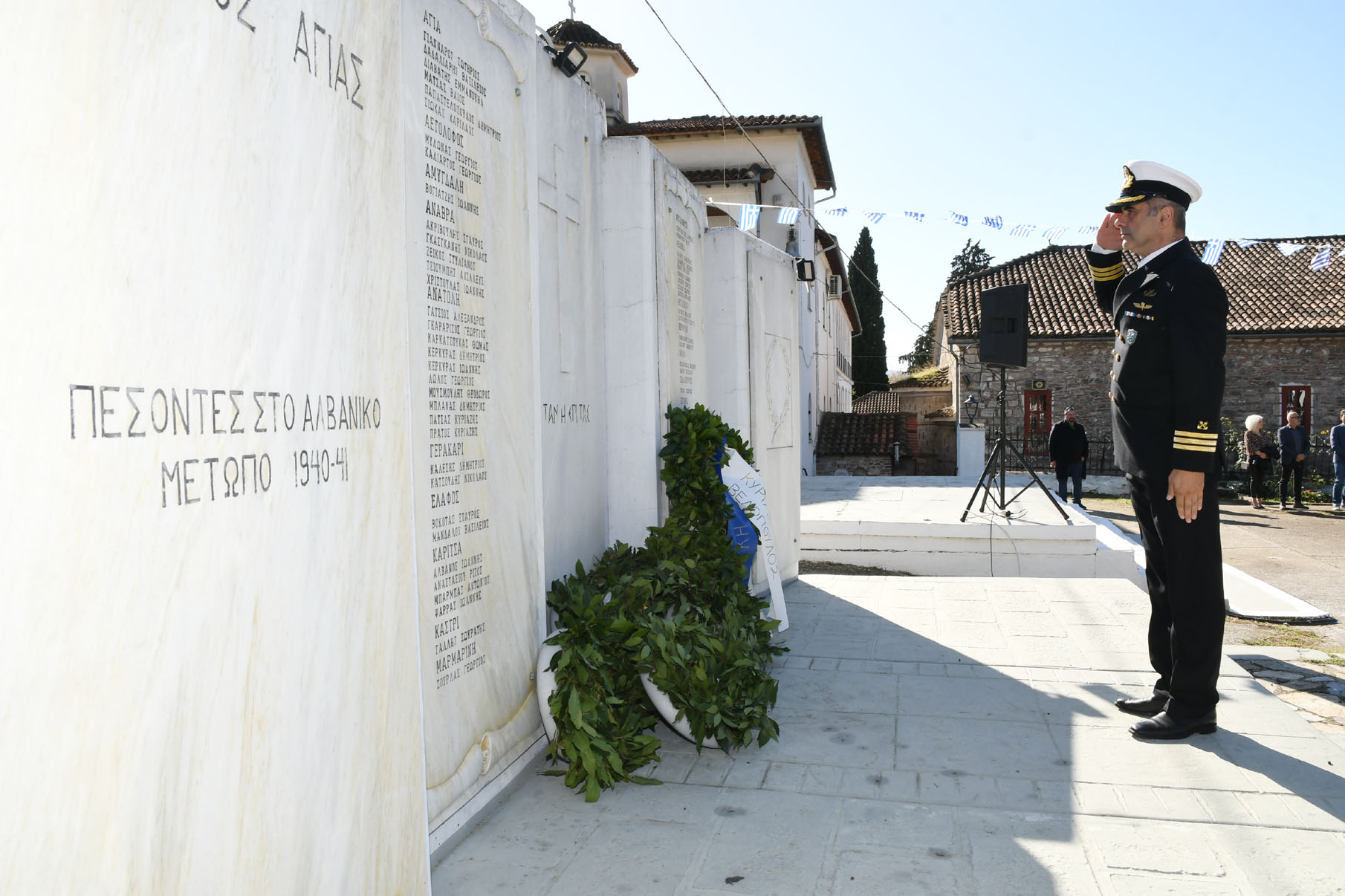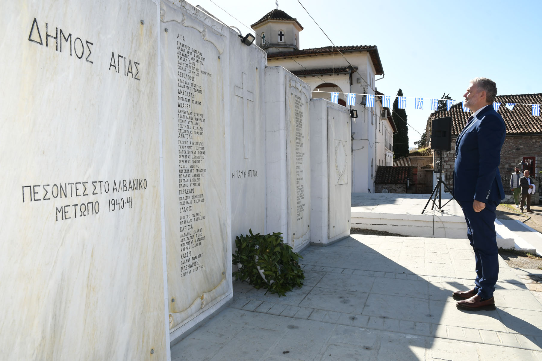 Ακολούθησε η εκφώνηση του πανηγυρικού της ημέρας από την διευθύντρια του 1ου Δημοτικού Σχολείου Αγιάς κ. Άννα Βαρνά, και στη συνέχεια εψάλη επιμνημόσυνη δέηση στο Μνημείο των Πεσόντων Αγωνιστών, κρατήθηκε ενός λεπτού σιγή, ακούστηκε ο Εθνικός μας Ύμνος, και κατατέθηκαν στεφάνια από τον αντιπεριφερειάρχη Αθλητισμού και Πολιτισμού, Σωτήρη Σουλούκο, εκπροσωπώντας την Περιφέρεια Θεσσαλίας, από τον δήμαρχο Αγιάς, Αντώνη Γκουντάρα, από την κ. Χριστίνα Κοντογιάννη εκ μέρους του κόμματος «Ελληνική Λύση», από την κ. Παρασκευή Νάκου εκ μέρους του κόμματος «Νίκη», Γραμματέα της Νομαρχιακής Κοινότητας Λάρισας, από τον εκπρόσωπο του Διοικητή Φρουράς ΑΤΑ, Επισμηναγό, Ιπτάμενο κ. Βασίλειο Κοντόπουλο εκ μέρους των Ενόπλων Δυνάμεων, από την Υποδιοικήτρια του Αστυνομικού Τμήματος Αγιάς, Υπαστυνόμο Α’ κ. Αρετή Κατωγιάννη, από τον Διοικητή του Πυροσβεστικού Κλιμακίου Αγιάς, Υποπυραγό κ. Χρήστο Καρνάβα, από τον Διοικητή του Λιμενικού Σταθμού Αγιοκάμπου, Πλωτάρχη κ. Χρήστο Αντωνίου, από τον τοπικό σύμβουλο της Δημοτικής Κοινότητας Αγιάς κ. Ζάχο Μπατζιόλα για την Εθνική Αντίσταση και τους Αναπήρους Πολέμου, από την διευθύντρια του 1ου Δημοτικού Σχολείου Αγιάς κ. Άννα Βαρνά εκ μέρους της σχολικής κοινότητας Πρωτοβάθμιας Εκπαίδευσης της περιοχής Αγιάς, από την κ. Βικτώρια Δημητρίου, διευθύντρια του Γενικού Λυκείου Αγιάς, εκ μέρους της Δευτεροβάθμιας Εκπαίδευσης, και από τον κ. Θεόδωρο Μαλαχτάρη εκ μέρους του Μορφωτικού Πολιτιστικού Συλλόγου Αγιωτών «Μιλτιάδης Δάλλας».
