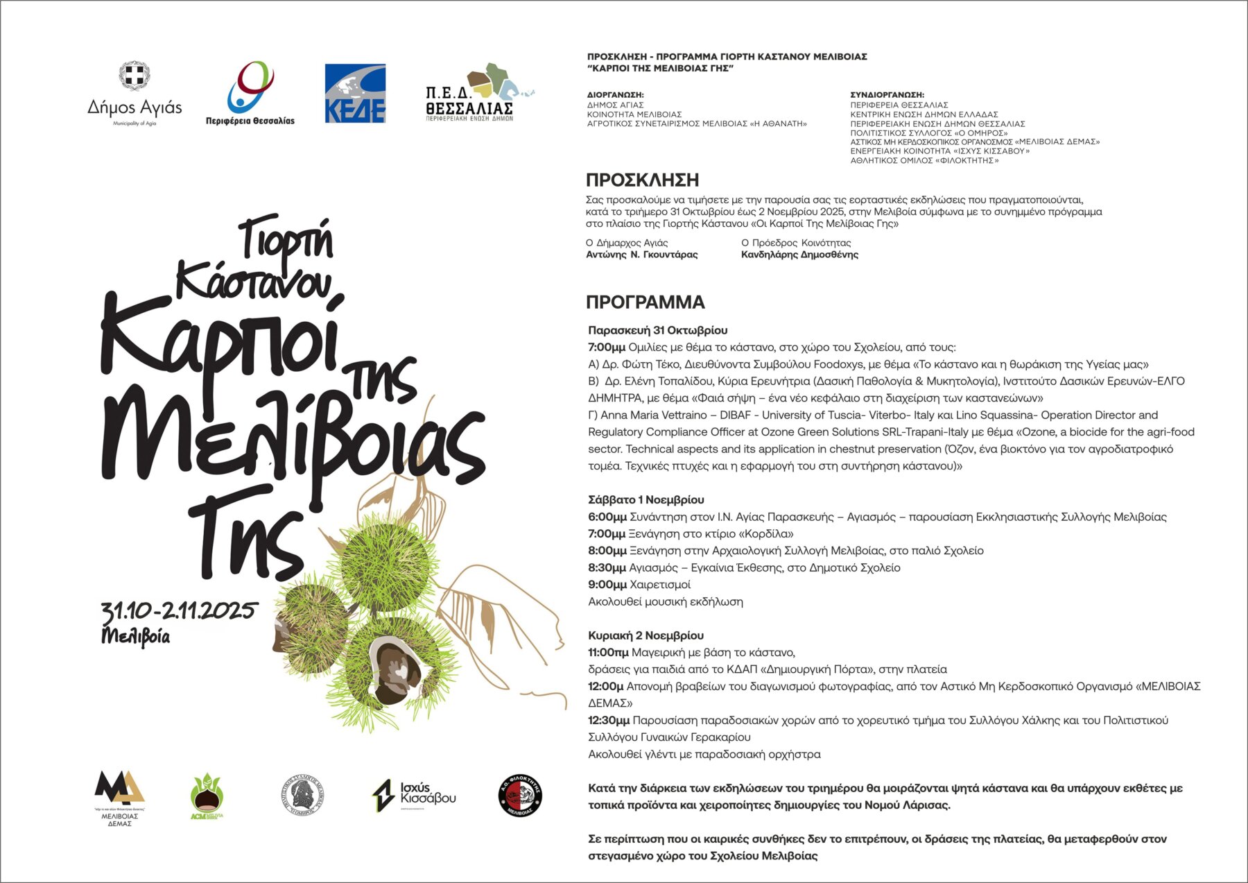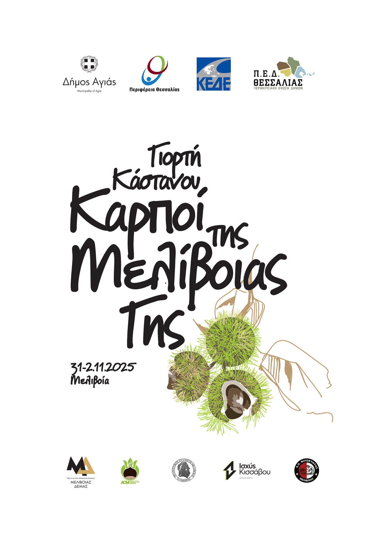 Ξεκινούν την Παρασκευή 31 Οκτωβρίου οι τριήμερες εκδηλώσεις για τη Γιορτή Κάστανου της Μελιβοίας, οι οποίες διοργανώνονται από τον Δήμο Αγιάς, την Κοινότητα Μελιβοίας και τον Αγροτικό Συνεταιρισμό Μελιβοίας «Η Αθανάτη».