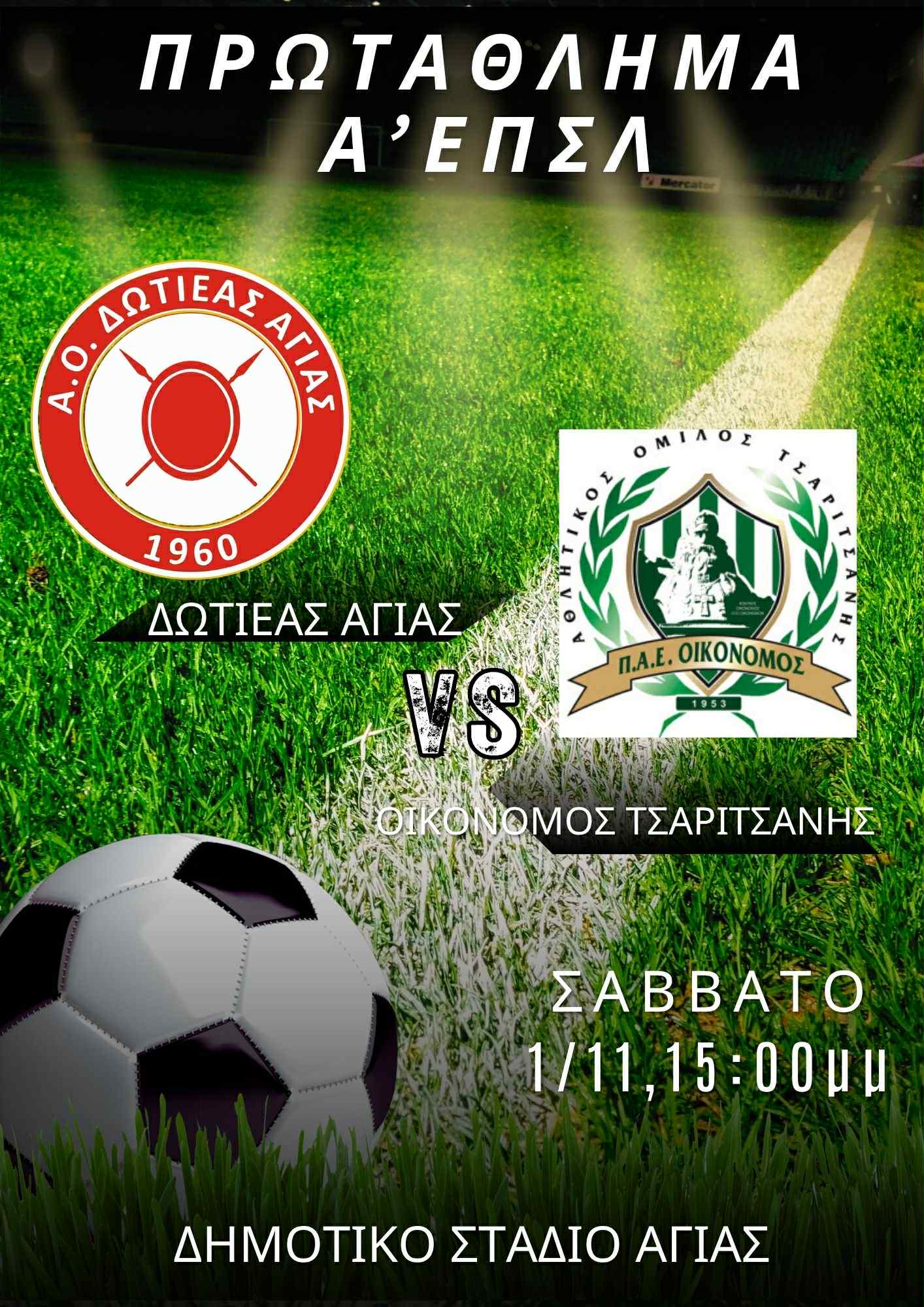 Ένα ακόμα δύσκολο παιχνίδι περιμένει τον Δωτιέα Αγιάς, ο οποίος αυτή τη φορά υποδέχεται τον Οικονόμο Τσαριτσάνης το Σάββατο 1η Νοεμβρίου, και ώρα 15:00, στο πλαίσιο της 7ης αγωνιστικής του πρωταθλήματος της Α’ ΕΠΣΛ.