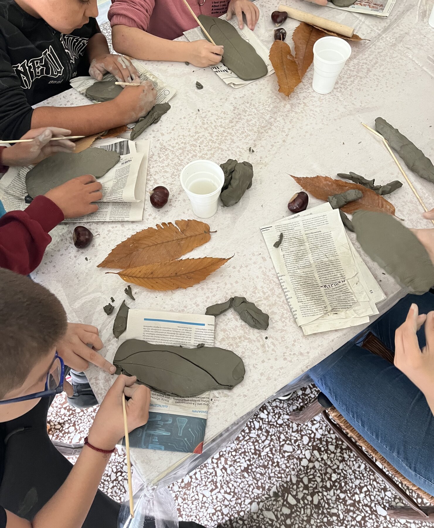 Στη συνέχεια, οι μαθητές άπλωσαν τα χέρια τους και βούτηξαν… στον πηλό! Με φαντασία και χαρά έπλασαν, με τη καθοδήγηση της κ. Γκουντουβά και τη βοήθεια των υπόλοιπων εκπαιδευτικών, μικρά έργα τέχνης: κάστανα, φύλλα και φθινοπωρινά στολίδια και σκευάσματα. Ο πηλός έγινε μέσο έκφρασης, συνεργασίας και παιχνιδιού. Ο χώρος του σχολείου μεταμορφώθηκε σε ένα εργαστήρι δημιουργίας και χαράς, όπου ο πηλός, το κάστανο και το γέλιο των παιδιών έγινε ένα.