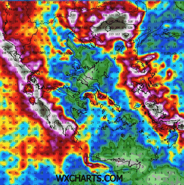 ΑΝΕΜΟΙ: Στα πεδινά νότιοι 2-3 μποφόρ και στα θαλάσσια νότιοι 6-7 μποφόρ.