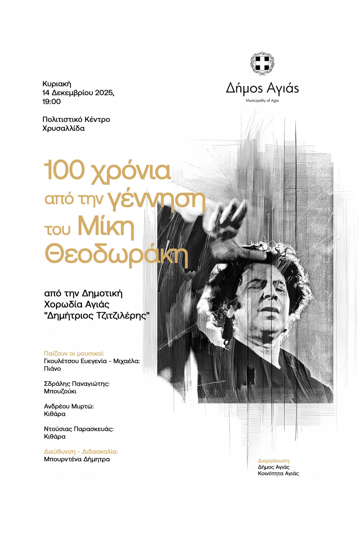 Την Κυριακή 14 Δεκεμβρίου, στις 7:00μμ, στο Πολιτιστικό Κέντρο Αγιάς “Χρυσαλλίδα”, η Δημοτική Χορωδία Αγιάς “Δημήτριος Τζιτζιλέρης” θα δώσει συναυλία – αφιέρωμα για τα 100 χρόνια από τη γέννηση του Μίκη Θεοδωράκη.