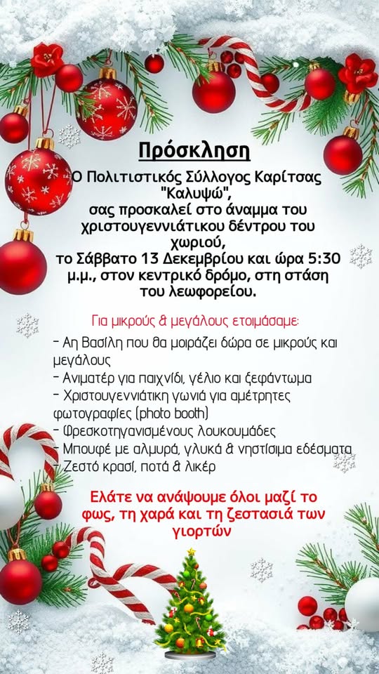 Ο Πολιτιστικός Σύλλογος Καρίτσας «Καλυψώ» διοργανώνει το Σάββατο 13 Δεκεμβρίου, στις 5:30μμ, στον κεντρικό δρόμο του χωριού, εκδήλωση φωταγώγησης του χριστουγεννιάτικου δέντρου.