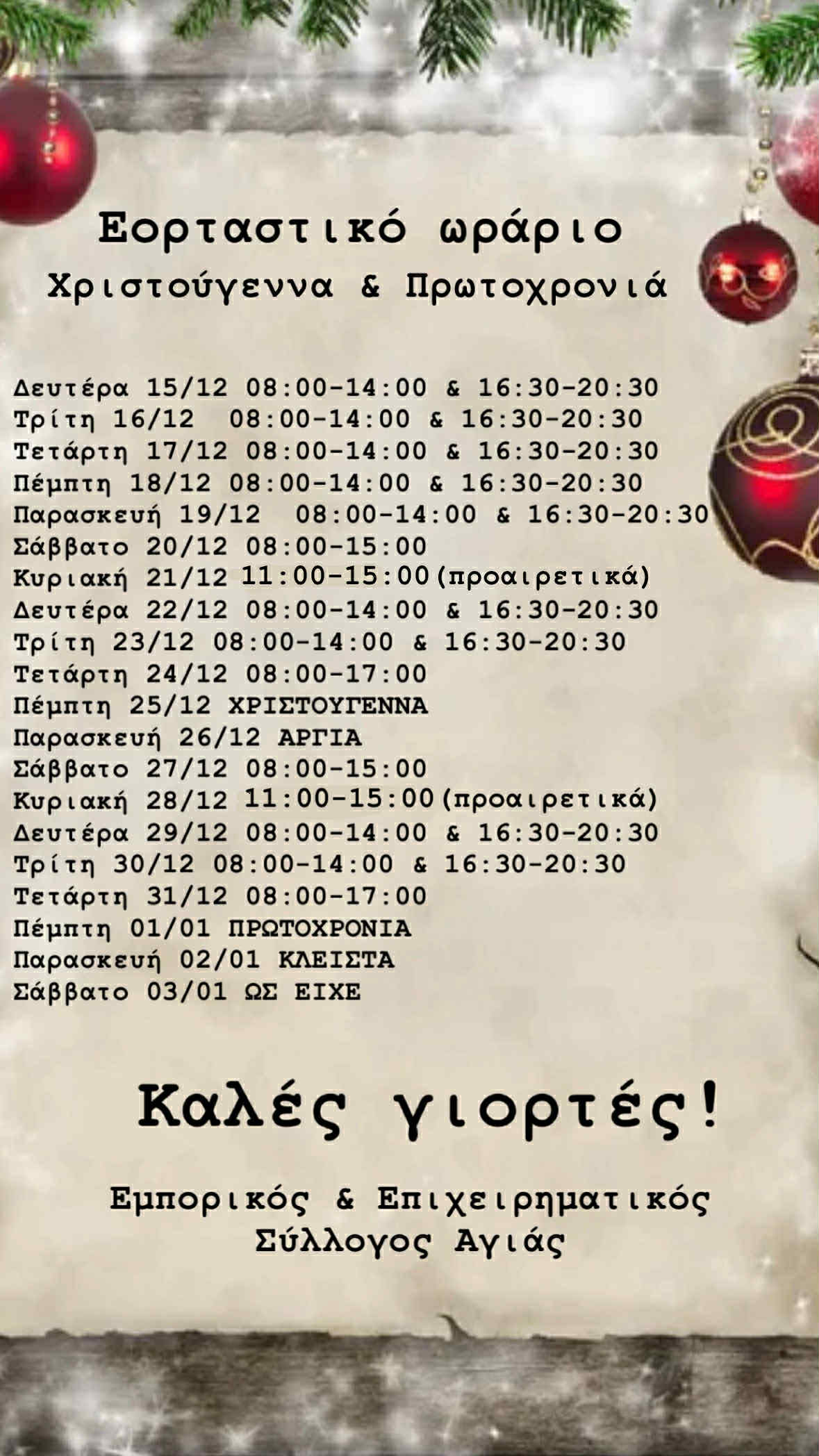 Το εορταστικό ωράριο των εμπορικών καταστημάτων της Αγιάς: