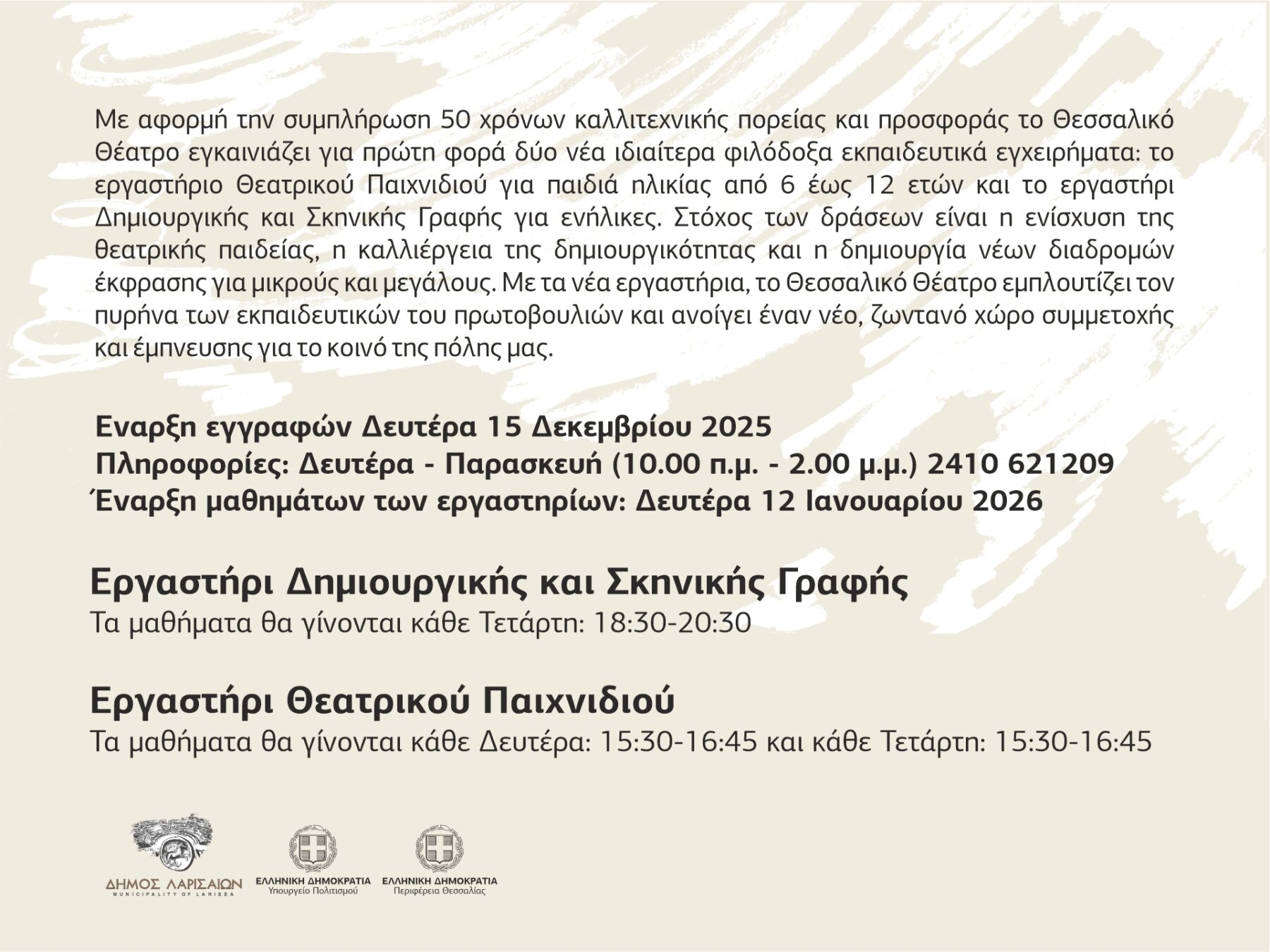 Με αφορμή την συμπλήρωση 50 χρόνων καλλιτεχνικής πορείας και προσφοράς, το Θεσσαλικό Θέατρο εγκαινιάζει για πρώτη φορά δύο νέα ιδιαίτερα φιλόδοξα εκπαιδευτικά εγχειρήματα: το εργαστήριο Θεατρικού Παιχνιδιού για παιδιά ηλικίας από 6 έως 12 ετών και το εργαστήρι Δημιουργικής και Σκηνικής Γραφής για ενήλικες.