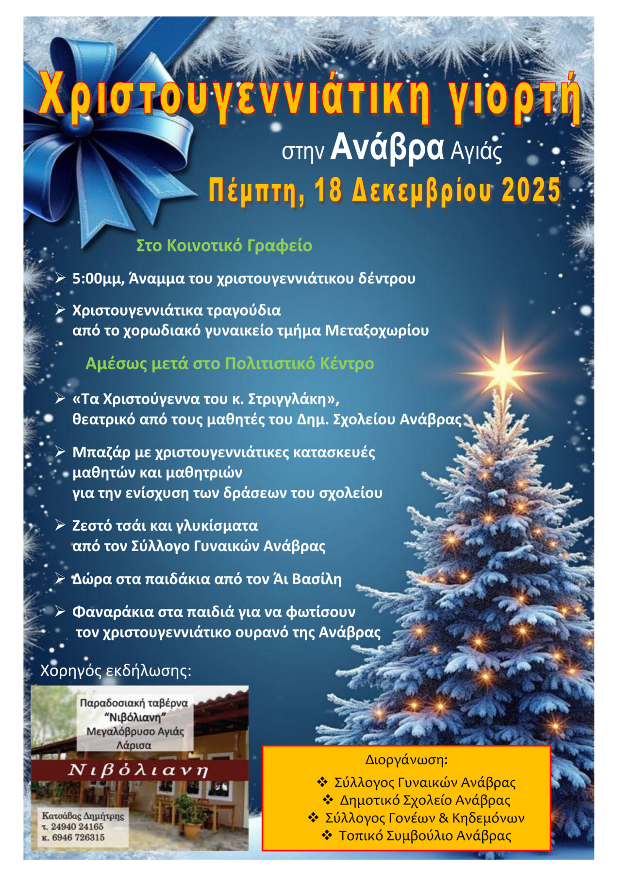 Ο Σύλλογος Γυναικών και η Κοινότητα Ανάβρας του Δήμου Αγιάς, με το Δημοτικό Σχολείο του χωριού και τον Σύλλογο Γονέων και Κηδεμόνων, συνδιοργανώνουν μια λαμπρή χριστουγεννιάτικη γιορτή, την Πέμπτη 18 Δεκεμβρίου, με το εξής πρόγραμμα εκδηλώσεων: