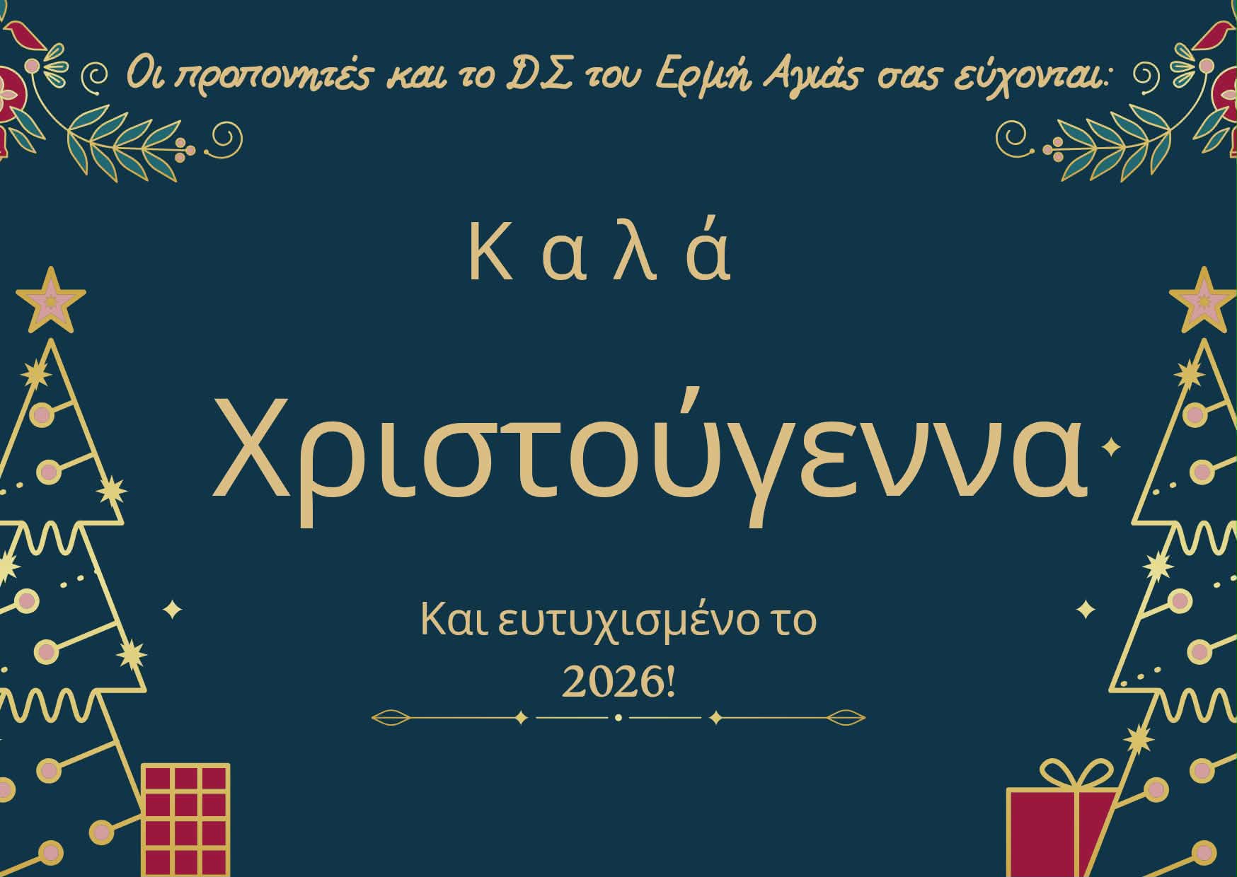 Ο Γυμναστικός Σύλλογος “Ερμής” Αγιάς και οι προπονητές του στέλνουν από καρδιάς τις πιο ζεστές χριστουγεννιάτικες ευχές σε όλους τους γονείς, τους αθλητές και το φίλαθλο κοινό που στέκεται δίπλα μας καθημερινά.