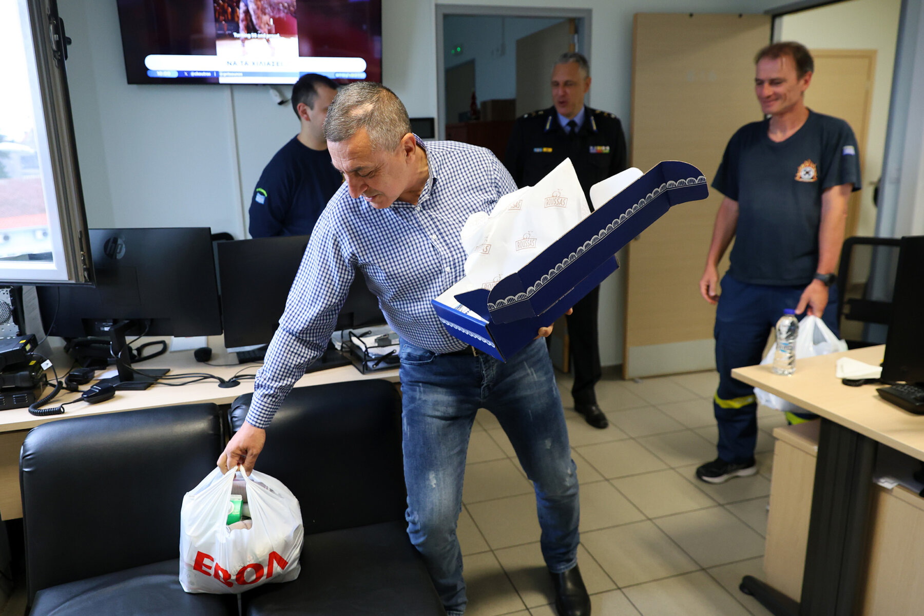 Ακόμη ο Περιφερειάρχης Θεσσαλίας επισκέφτηκε το Πυροσβεστικό Σώμα που βρίσκεται στον ίδιο όροφο του Διοικητηρίου με το Γραφείο του Περιφερειάρχη για να ευχηθεί στους μάχιμους πυροσβέστες Καλά Χριστούγεννα, κουράγιο στο δύσκολο έργο τους και να τους μοιράσει δώρα.