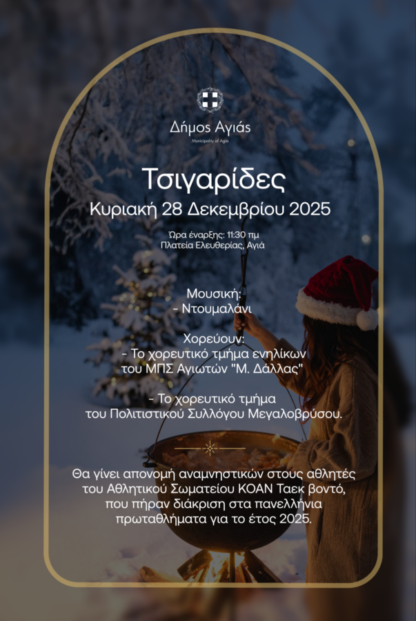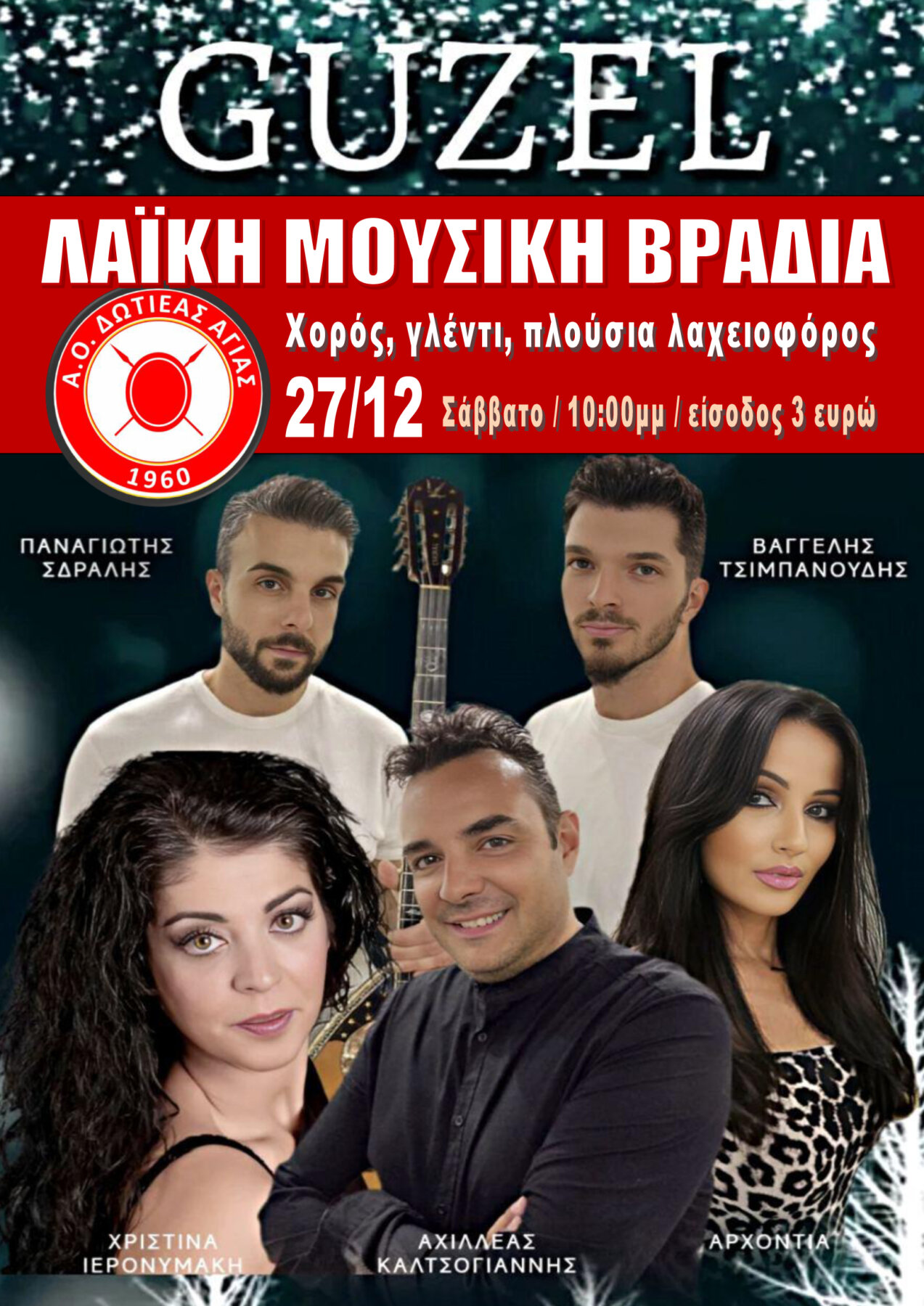 Μια ξεχωριστή μουσική λαϊκή βραδιά διοργανώνει ο Α.Ο. “Δωτιέας” Αγιάς, το Σάββατο 27 Δεκεμβρίου, στο all day bar Guzel στην Αγιά, βραδιά με πολύ χορό και πλούσια λαχειοφόρο.