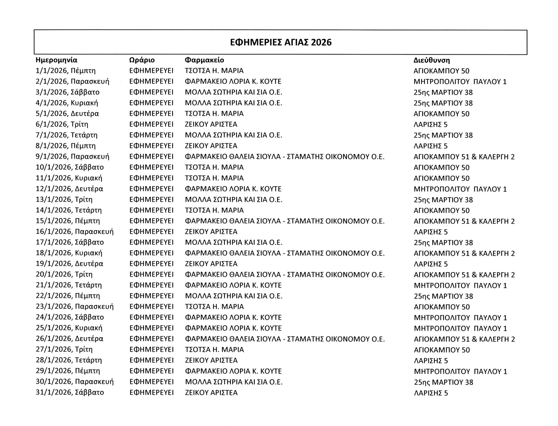 Οι εφημερίες των φαρμακείων της Αγιάς ως 31 Ιανουαρίου 2026: