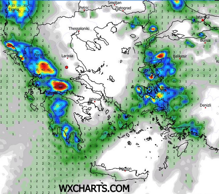 ΑΝΕΜΟΙ: Στα πεδινά νοτιοδυτικοί 3 μποφόρ, ενώ στα ορεινά και θαλάσσια νοτιοδυτικοί 6-7 μποφόρ.