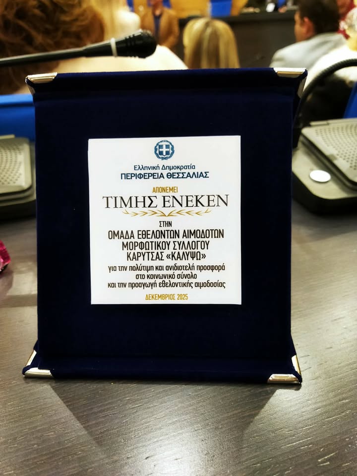 Για την πολύτιμη προσφορά του στην εθελοντική αιμοδοσία βραβεύτηκε προ ημερών από την Περιφέρεια Θεσσαλίας ο Πολιτιστικός Σύλλογος Καρίτσας Δήμου Αγιάς “Καλυψώ”.