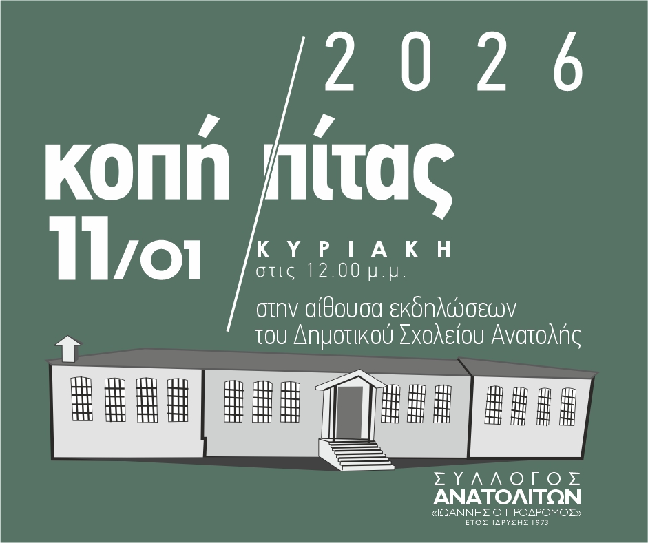 Ο Σύλλογος Ανατολιτών «Ιωάννης ο Πρόδρομος» διοργανώνει εκδήλωση κοπής της πρωτοχρονιάτικης βασιλόπιτας, την Κυριακή 11 Ιανουαρίου 2026, στις 12:00 μ.μ., στην αίθουσα εκδηλώσεων του Δημοτικού Σχολείου Ανατολής.