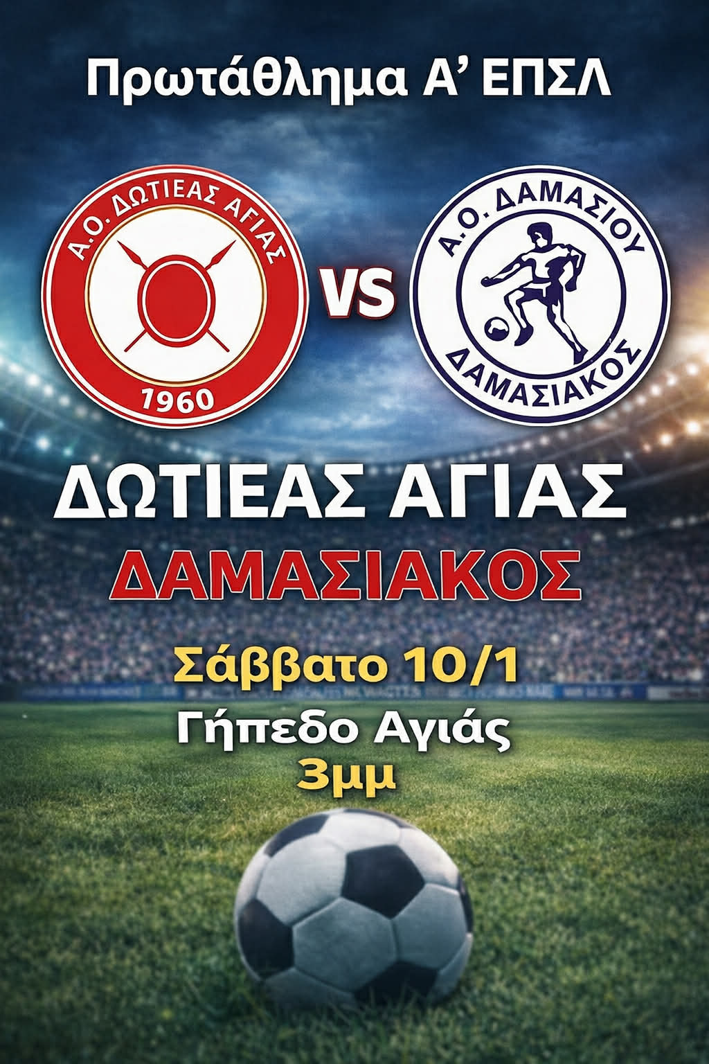 Ο εκπρόσωπος του Δήμου Αγιάς, Δωτιέας, αγωνίζεται το Σάββατο (10/1, 15:00) στη φυσική του έδρα -το δημοτικό στάδιο Αγιάς- κόντρα στον Δαμασιακό, με στόχο να ξεκινήσει νικηφόρα τις αγωνιστικές του υποχρεώσεις στο νέο έτος.