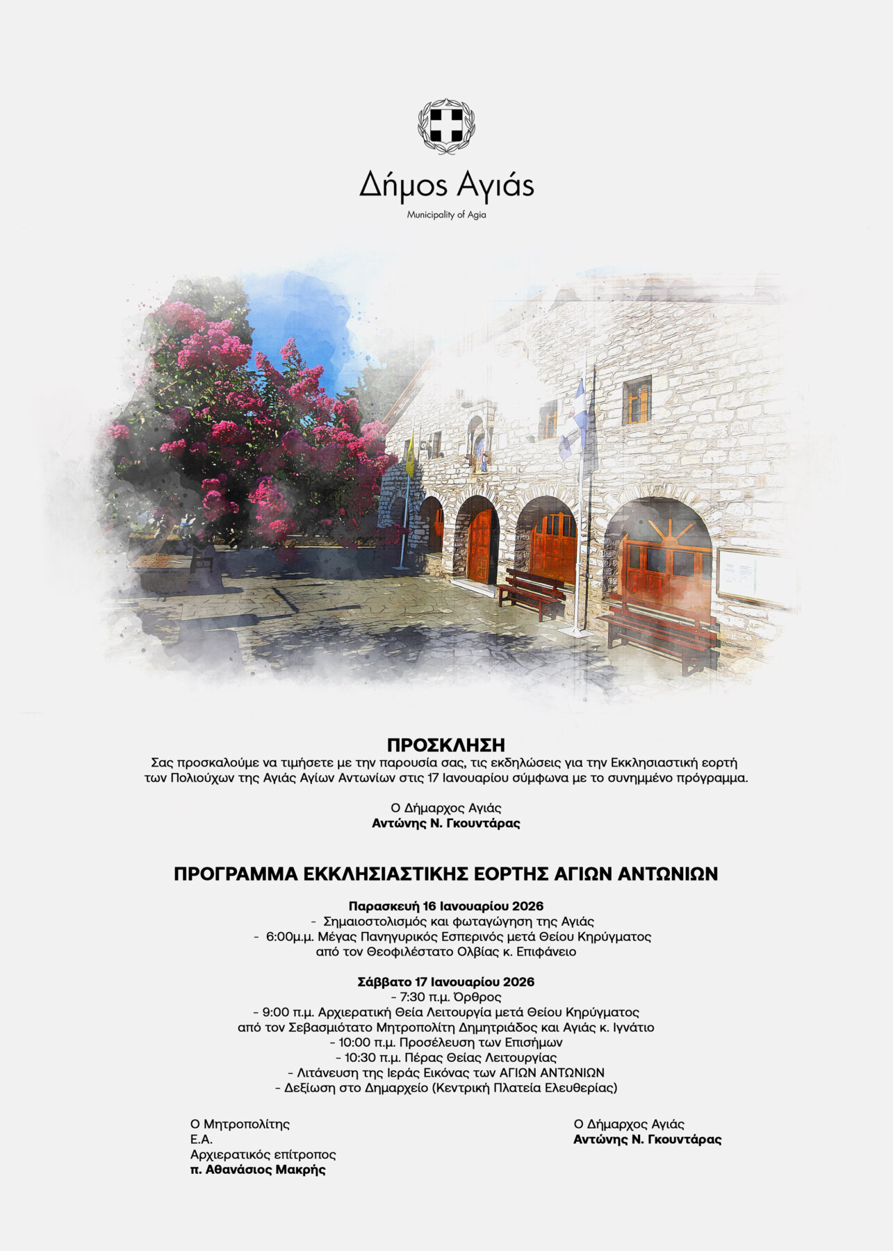 Τη μνήμη των πολιούχων της Αγίων, Αντωνίου του Μεγάλου και Αντωνίου του Νέου του εν Βεροίας, τιμά το προσεχές Σάββατο 17 Ιανουαρίου η Αγιά.