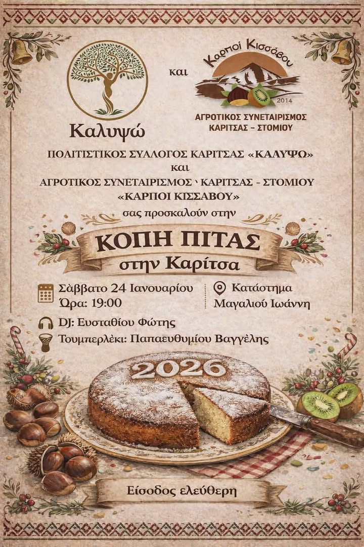 Ο Πολιτιστικός & Φυσιολατρικός Σύλλογος Καρίτσας «Καλυψώ», σε συνεργασία με τον Αγροτικό Συνεταιρισμό Καρίτσας – Στομίου «Καρποί Κισσάβου», διοργανώνουν εκδήλωση κοπής της πρωτοχρονιάτικης πίτας, το Σάββατο 24 Ιανουαρίου, στις 7:00μμ, στο κατάστημα Μαγαλιού Ιωάννη στην Καρίτσα του Δήμου Αγιάς, με dj τον Ευσταθίου Φώτη και στο τουμπερλέκι τον Παπαευθυμίου Βαγγέλη.