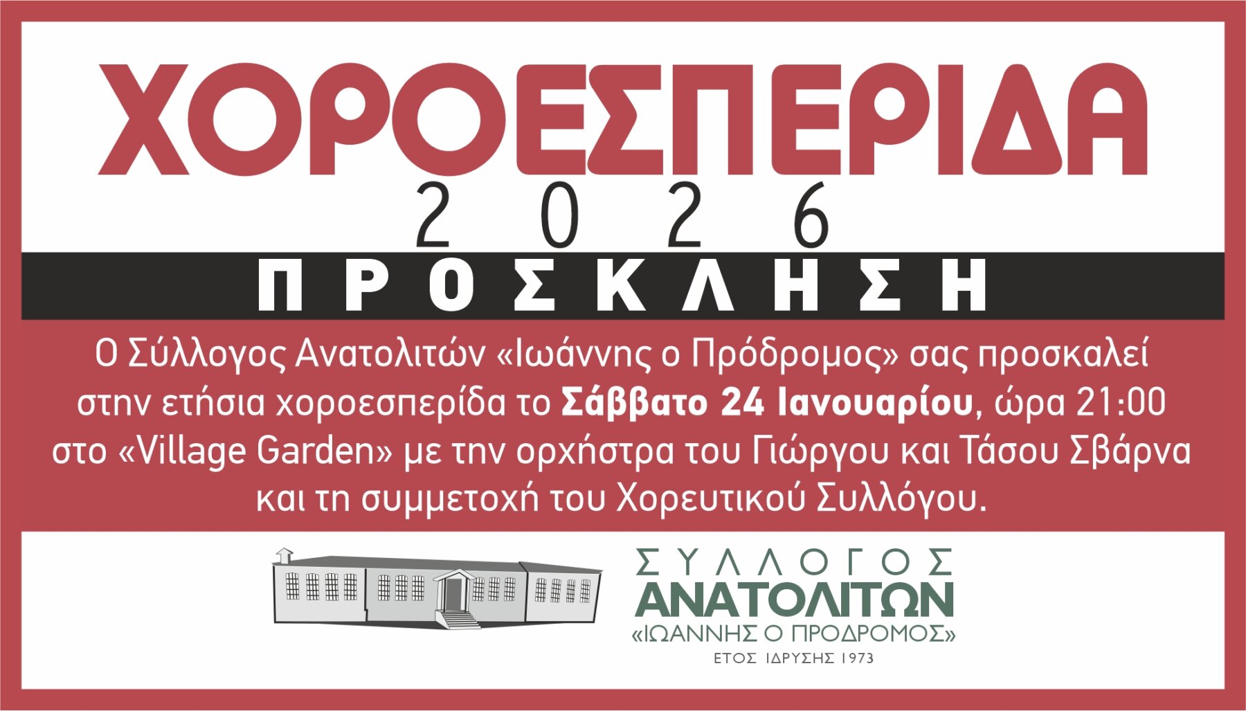 Ο Σύλλογος Ανατολιτών «Ιωάννης ο Πρόδρομος» ευχαριστεί θερμά όλους όσοι παρευρέθηκαν και συνέβαλαν με οποιονδήποτε τρόπο στην επιτυχή διοργάνωση της εκδήλωσης, ανανεώνοντας το ραντεβού για την χοροεσπερίδα το Σάββατο 24 Ιανουαρίου.
