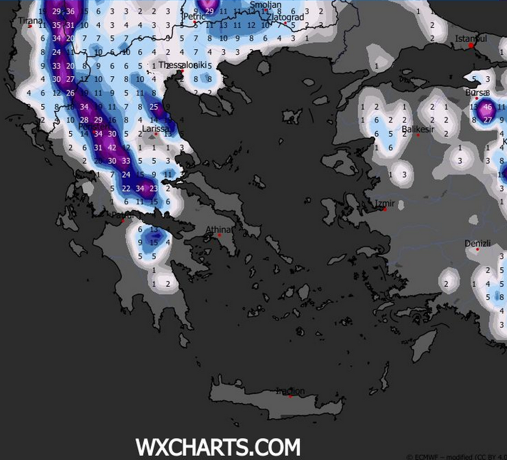 ΘΕΡΜΟΚΡΑΣΙΑ: Στα πεδινά των νομών Λάρισας, Τρικάλων και Καρδίτσας από 0 έως 12/13 βαθμούς κελσίου, στην Μαγνησία, τα παράλια και τις Σποράδες από 4 έως 13 βαθμούς κελσίου.