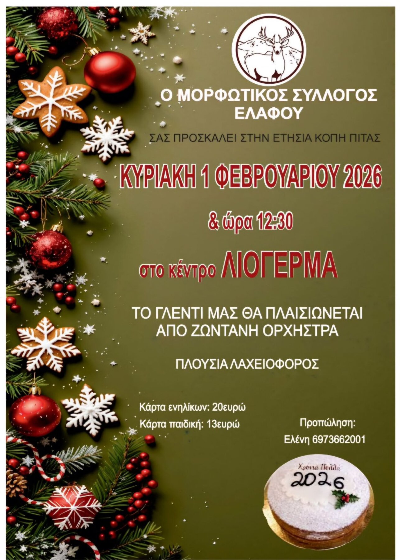 Ο Μορφωτικός Σύλλογος Ελάφου Δήμου Αγιάς διοργανώνει την ετήσια εκδήλωση κοπής της πρωτοχρονιάτικης βασιλόπιτας, την Κυριακή 1 Φεβρουαρίου και ώρα 12:30 το μεσημέρι, στο κέντρο “Λιόγερμα” στο 6ο χλμ. Λάρισας-Αμπελώνα, με ζωντανή μουσική και πλούσια λαχειοφόρο.