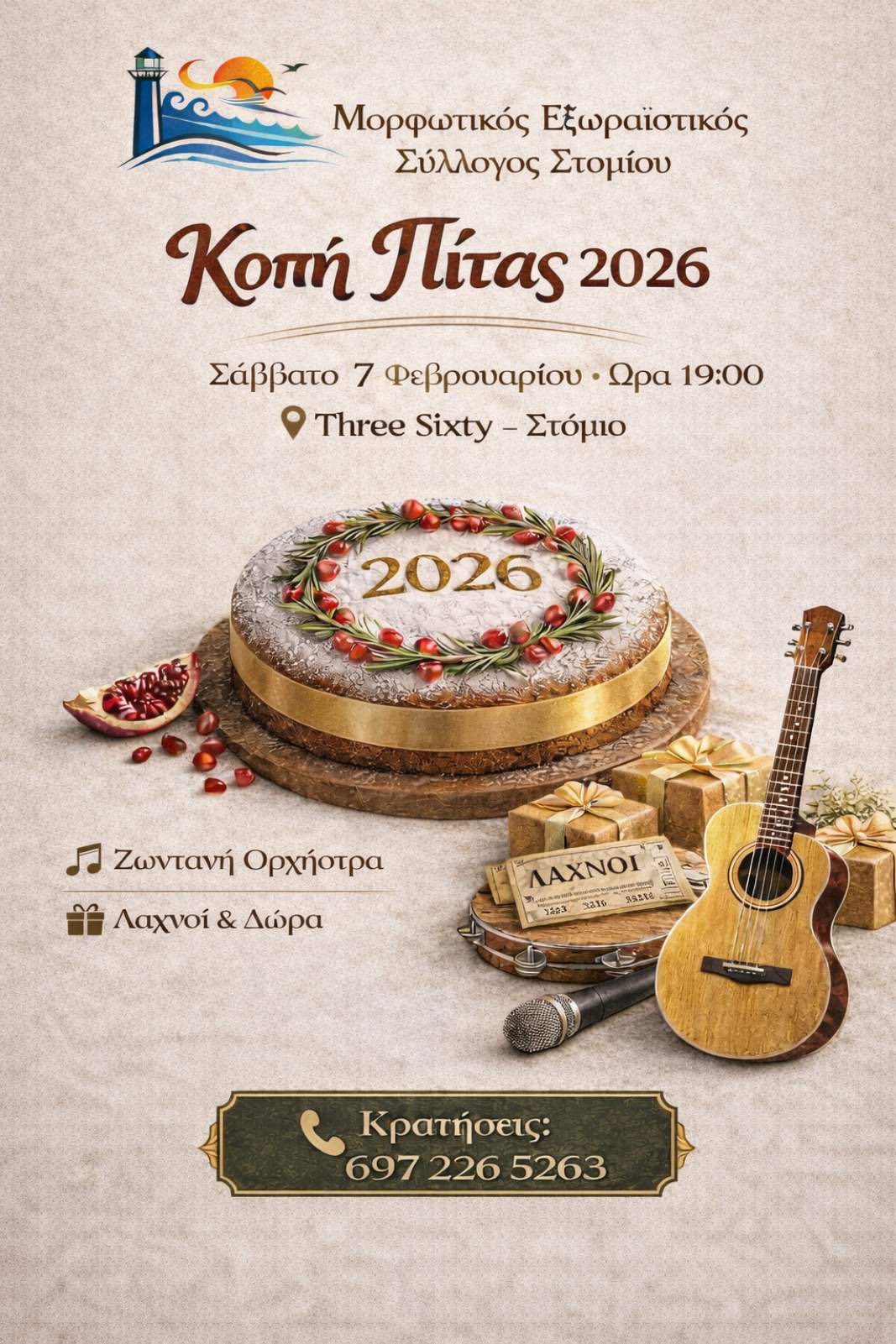 Ο Μορφωτικός Εξωραϊστικός Σύλλογος Στομίου προσκαλεί κατοίκους και φίλους της περιοχής στην καθιερωμένη κοπή της πρωτοχρονιάτικης πίτας του, το Σάββατο 7 Φεβρουαρίου, στις 19:00, στο κατάστημα Three Sixty στο Στόμιο.