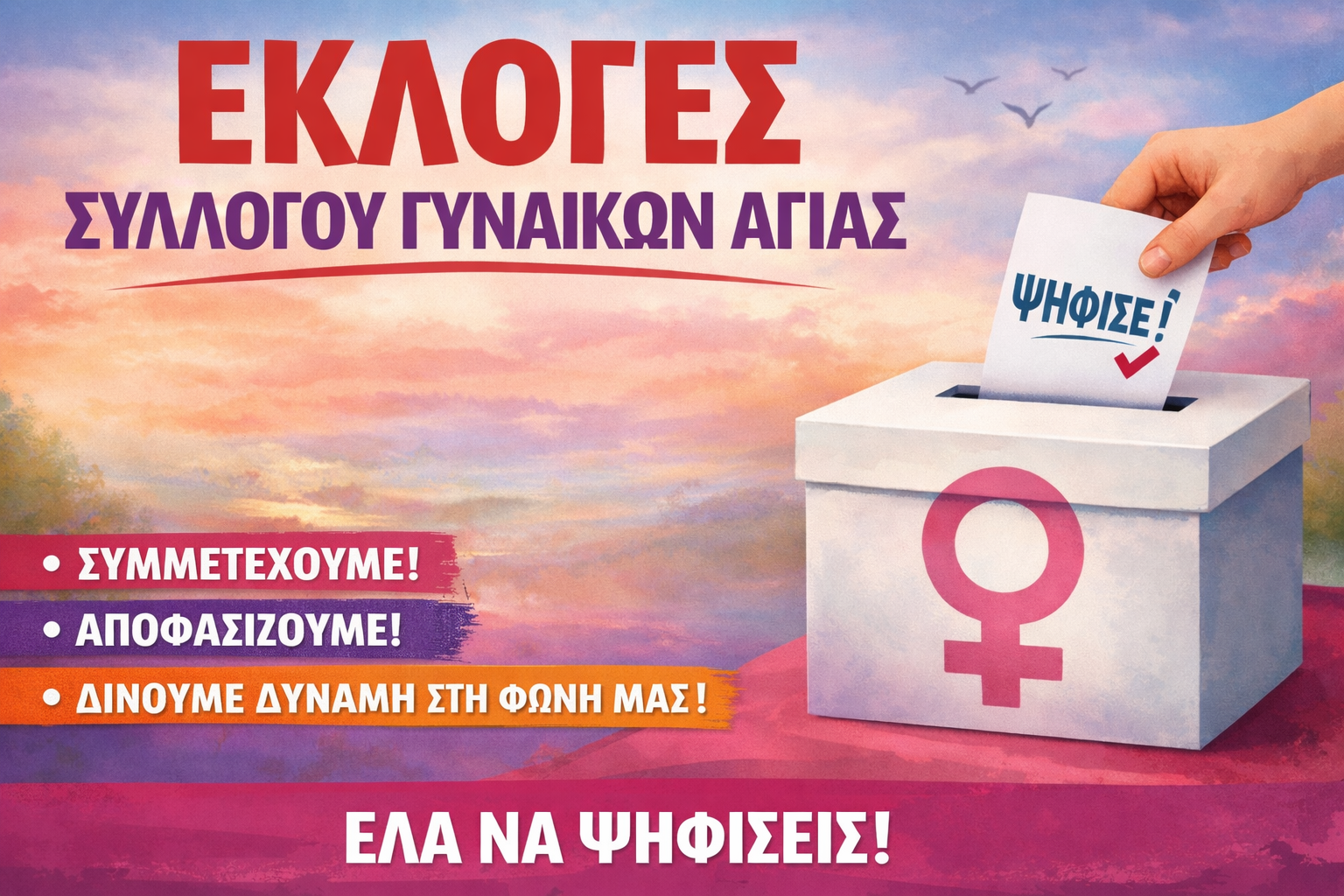 Την Κυριακή 15 Φεβρουαρίου, από τις 4:00μμ ως τις 7:00μμ, στο οικογενειακό κέντρο “Χατζάκος” στην Αγιά (πλατεία Φιλύρων), θα πραγματοποιηθούν εκλογές για την ανάδειξη νέου διοικητικού συμβουλίου του Συλλόγου Γυναικών Αγιάς.