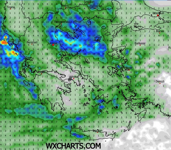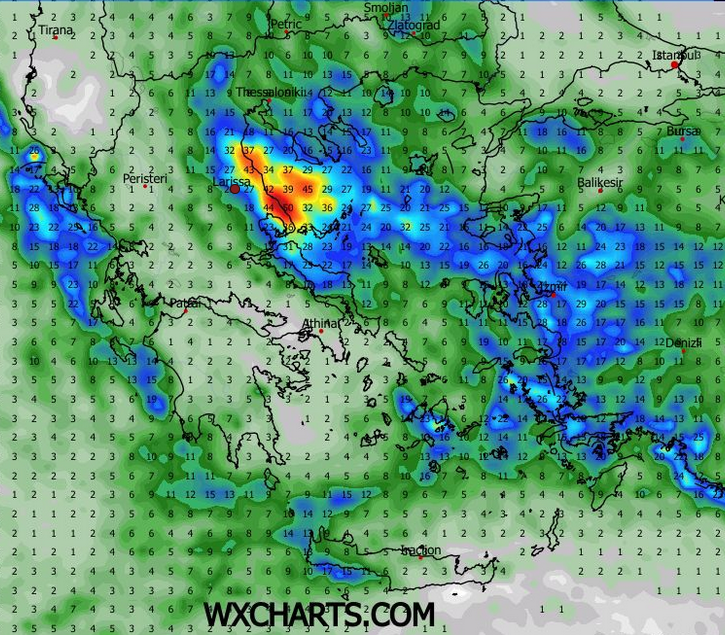 ΠΡΟΣΟΧΗ! Σε Κίσσαβο, Μαυροβούνι, παράλια Λάρισας και ανατολικό Πήλιο, καθώς εκεί θα εστιαστούν τα έντονα φαινόμενα από τη νύχτα της Δευτέρας έως τις πρωινές ώρες της Τρίτης. Να τονίσω ότι δεν αναμένονται τα ύψη βροχής που είχαμε στις τελευταίες πλημμύρες, αλλά καθώς το έδαφος είναι πολύ κορεσμένο μετά και από τις τελευταίες πολλές βροχές που έχουν σημειωθεί, πλέον δεν μπορεί να δεχθεί άλλο νερό. Επαγρύπνηση και προσοχή στον Δήμο Αγιάς που επλήγη ιδιαίτερα στην τελευταία κακοκαιρία. Συνολικά στα ανατολικά τμήματα αναμένονται έως και 60 χιλιοστά βροχής.