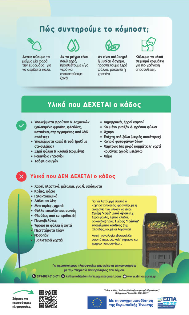 Επικοινωνία: Υπηρεσία Καθαριότητας Δήμου Αγιάς στα τηλ. 2494024510-511 και στο email: kathariotita.kimitiria.agias@gmail.com