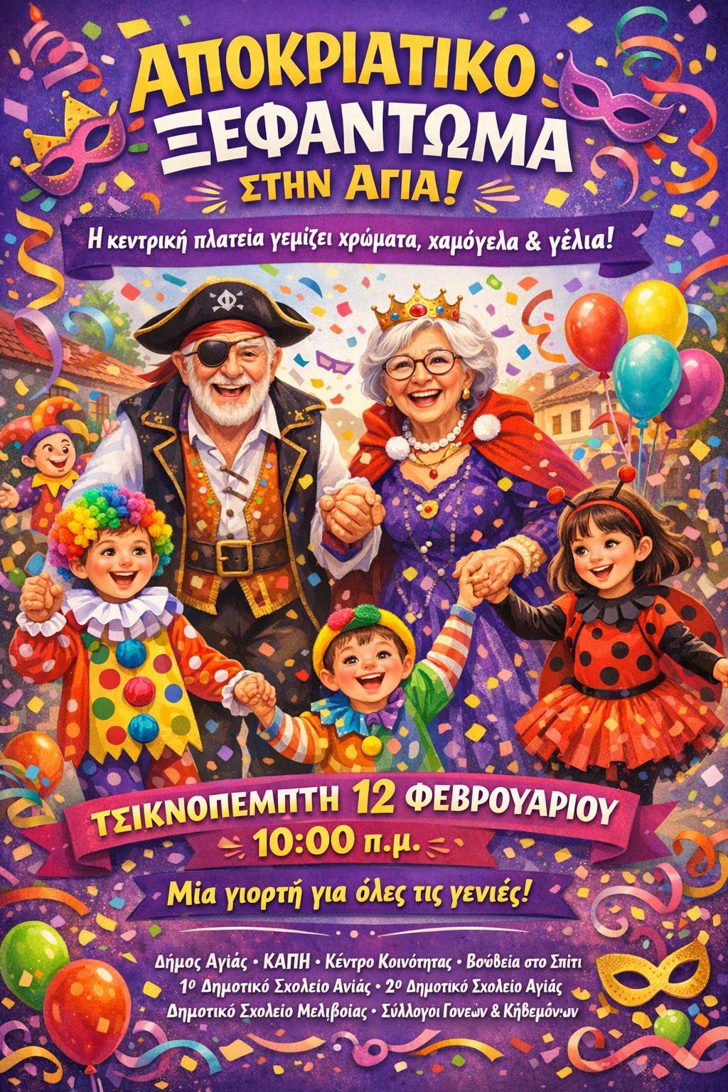 Ο Δήμος Αγιάς, η Διεύθυνση Κοινωνικής Πρόνοιας, Παιδείας, Πολιτισμού, Αθλητισμού κι Εξυπηρέτησης του Πολίτη, με τη συμμετοχή του ΚΑΠΗ, προσκαλεί μικρούς και μεγάλους σε μια ξεχωριστή αποκριάτικη γιορτή, γεμάτη χρώματα, χαμόγελα και κέφι, την Τσικνοπέμπτη 12 Φεβρουαρίου, στις 10:00 π.μ., στην Κεντρική πλατεία της Αγιάς.