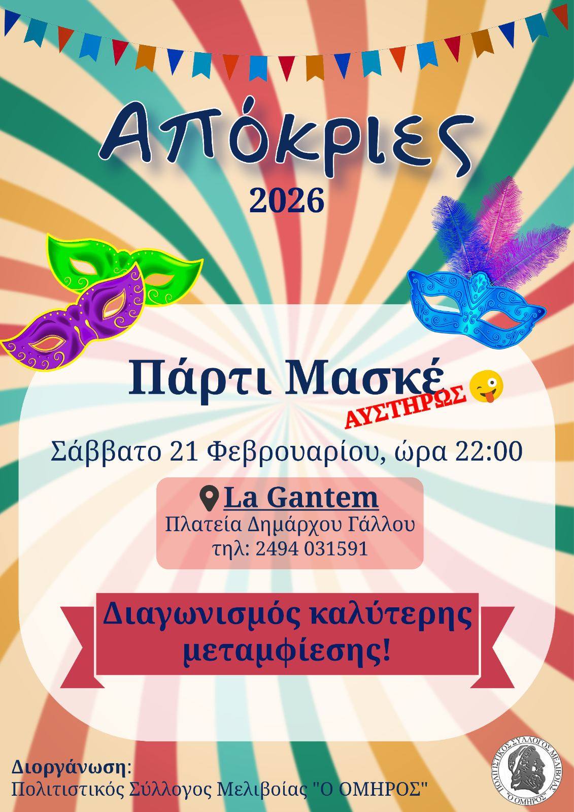 Σάββατο 21 Φεβρουαρίου, 10:00μμ, πάρτι μασκέ στο εστιατόριο La Gantem (πλατεία Δημάρχου Γάλλου), με διαγωνισμό για την καλύτερη μεταμφίεση.