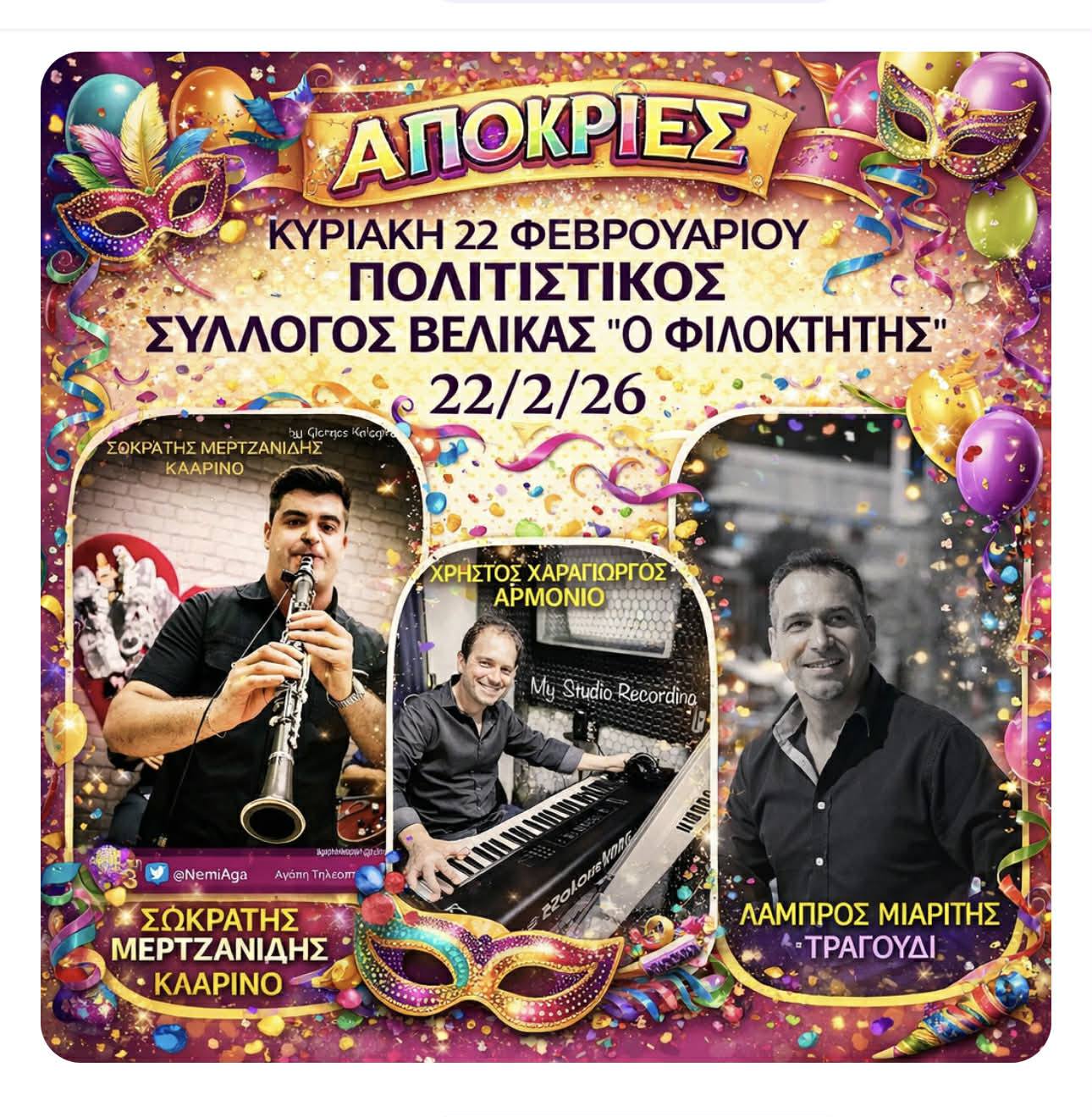 Αποκριάτικο ξεφάντωμα οργανώνει στη Βελίκα του Δήμου Αγιάς ο τοπικός Πολιτιστικός Σύλλογος “Φιλοκτήτης”, την Κυριακή της Αποκριάς 22 Φεβρουαρίου, από τις 5μμ μέχρι τις 9μμ, με άναμμα φωτιάς, κάψιμο καρνάβαλου και με ζωντανή μουσική (παραδοσιακά και αποκριάτικα τραγούδια) από την ορχήστρα των Σωκράτη Μερτζανίδη (κλαρίνο), Λάμπρου Μιαρίτη (τραγούδι), Χρήστου Καραγιώργου (αρμόνιο).