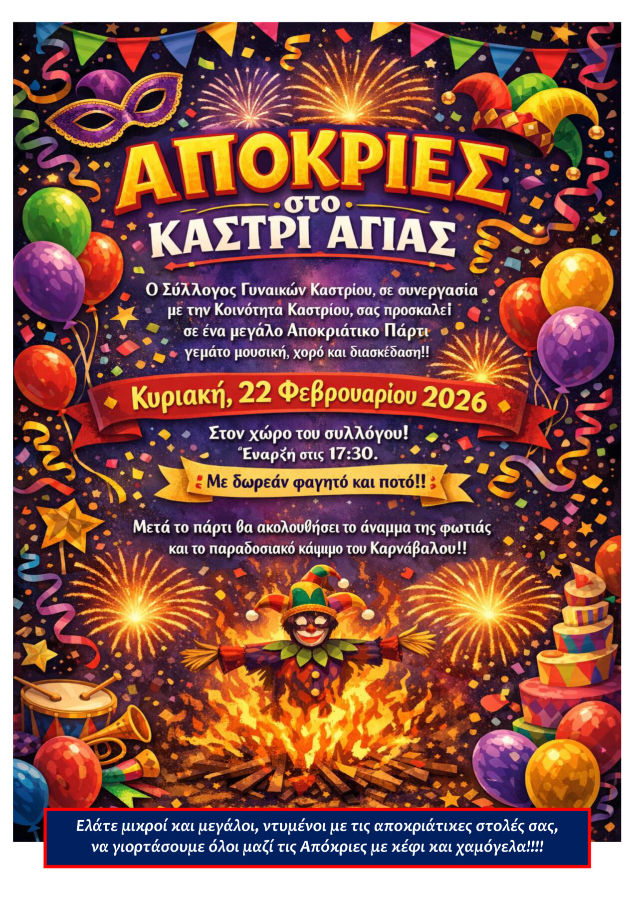 Ο Σύλλογος Γυναικών Καστρίου, σε συνεργασία με την Κοινότητα Καστρίου, διοργανώνουν μεγάλο αποκριάτικο πάρτι, γεμάτο μουσική, χορό και διασκέδαση, με δωρεάν φαγητό και ποτό, στον χώρο του συλλόγου στο Καστρί, στις 5:30μμ, την Κυριακή 22 Φεβρουαρίου. Θα ακολουθήσει άναμμα της φωτιάς και το παραδοσιακό κάψιμο του καρνάβαλου.