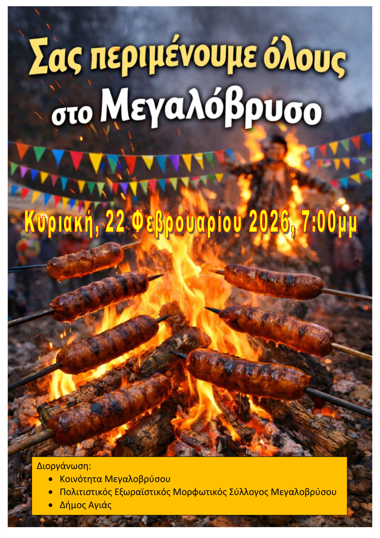 Η Κοινότητα Μεγαλοβρύσου, ο Πολιτιστικός Εξωραϊστικός Μορφωτικός Σύλλογος Μεγαλοβρύσου και ο Δήμος Αγιάς διοργανώνουν αποκριάτικη εκδήλωση στην πλατεία του Μεγαλοβρύσου, την Κυριακή 22 Φεβρουαρίου, στις 7:00μμ.