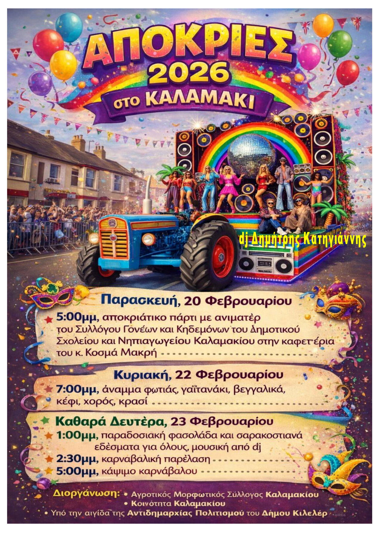 Παρασκευή, 20 Φεβρουαρίου, 5:00μμ, αποκριάτικο πάρτι με ανιματέρ του Συλλόγου Γονέων και Κηδεμόνων του Δημοτικού Σχολείου και Νηπιαγωγείου Καλαμακίου στην καφετέρια του κ. Κοσμά Μακρή.
