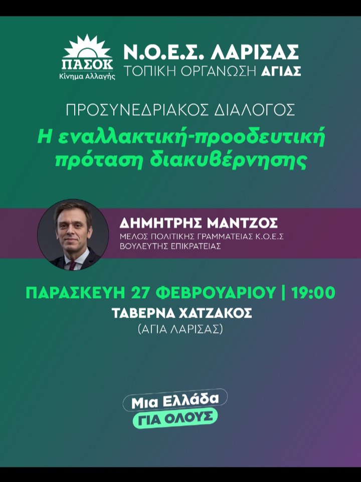 Η Νομαρχιακή Οργανωτική Επιτροπή Συνεδρίου Λάρισας και η Τοπική Οργάνωση Αγιάς του ΠΑΣΟΚ, ενόψει του συνεδρίου του στα τέλη Μαρτίου, και στο πλαίσιο του προσυνεδριακού διαλόγου, προσκαλούν μέλη και φίλους του Κινήματος να συμμετάσχουν στην εκδήλωση συζήτησης και διαλόγου με καλεσμένο τον βουλευτή Επικρατείας κ. Μάντζιο Δημήτριο, την Παρασκευή 27 Φεβρουαρίου, στις 7:00μμ, στην ταβέρνα “Χατζάκος” στην Αγιά (πλατεία Φιλύρων).