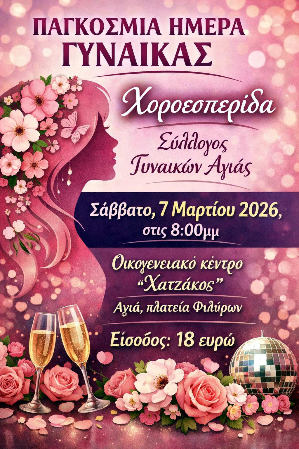 Ο Σύλλογος Γυναικών Αγιάς, θέλοντας να γιορτάσει την Παγκόσμια Ημέρα της Γυναίκας, διοργανώνει χοροεσπερίδα, το Σάββατο 7 Μαρτίου, στις 8:00μμ, στο οικογενειακό κέντρο “Χατζάκος” στην Αγιά (πλατεία Φιλύρων).
