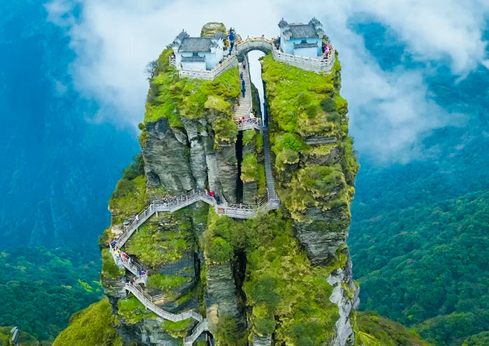 Η δεύτερη είναι το Όρος Φαντζίνγκ (Fanjingshan), ένα ιερό βουνό με εντυπωσιακούς ναούς στην κορυφή. Βρίσκεται στην επαρχία Γκουιτζόου (Guizhou) στη νοτιοδυτική Κίνα και αποτελεί την υψηλότερη κορυφή των βουνών Γουλίνγκ (Wuling) με υψόμετρο 2.570 μέτρα. Είναι παγκοσμίως γνωστό για τον «Χρυσό Βράχο των Κόκκινων Σύννεφων», όπου δύο ναοί είναι χτισμένοι πάνω σε δύο απόκρημνες κορυφές, οι οποίες ενώνονται με μια μικρή γέφυρα. Θεωρείται ιερό βουνό του Κινεζικού Βουδισμού και είναι Μνημείο Παγκόσμιας Κληρονομιάς της UNESCO από το 2018. Αποτελεί σημαντικό τουριστικό αξιοθέατο και οι επισκέπτες μπορούν να φτάσουν στην κορυφή μέσω τελεφερίκ ή ανεβαίνοντας χιλιάδες σκαλοπάτια.