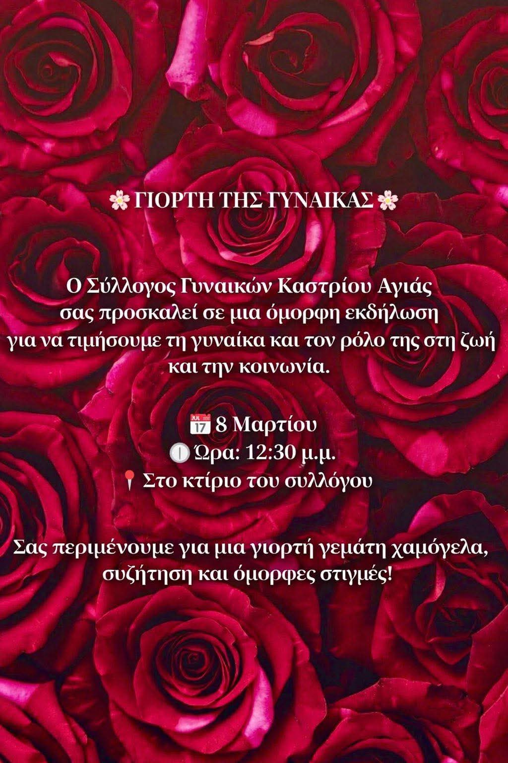 Ο Σύλλογος Γυναικών Καστρίου Αγιάς, με αφορμή την Παγκόσμια Ημέρα Γυναίκας, διοργανώνει εκδήλωση τιμής προς την γυναίκα και τον ρόλο της στη ζωή και την κοινωνία, την Κυριακή 8 Μαρτίου, στις 12:30μμ, στο κτίριο του συλλόγου στο Καστρί.