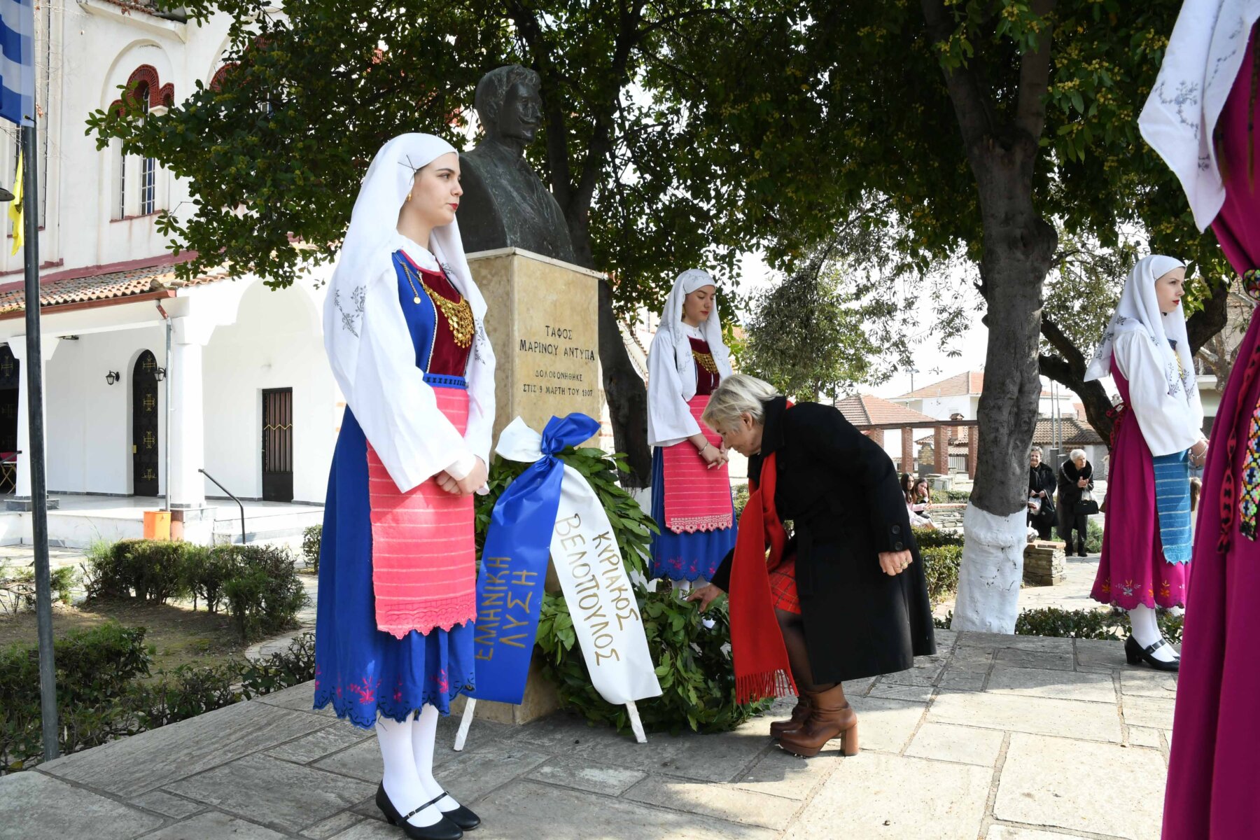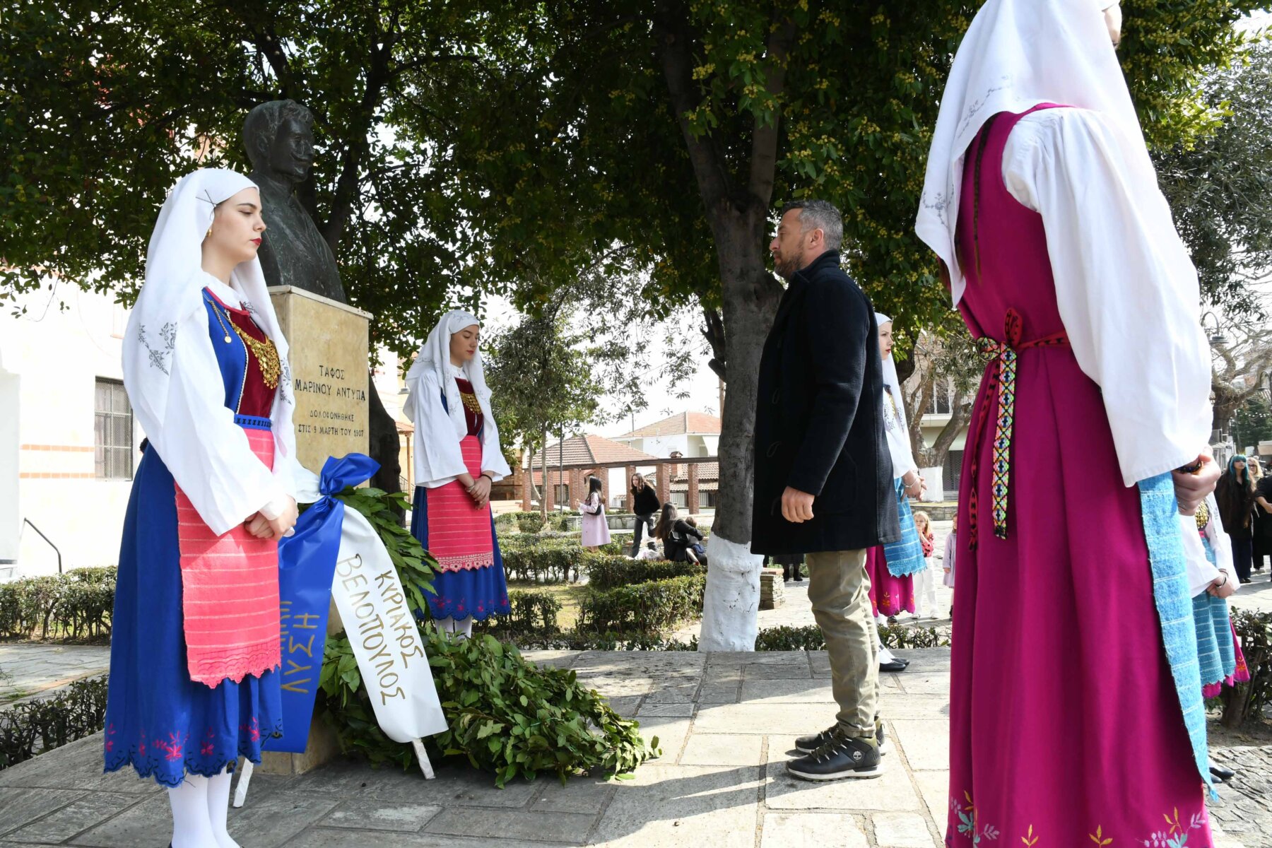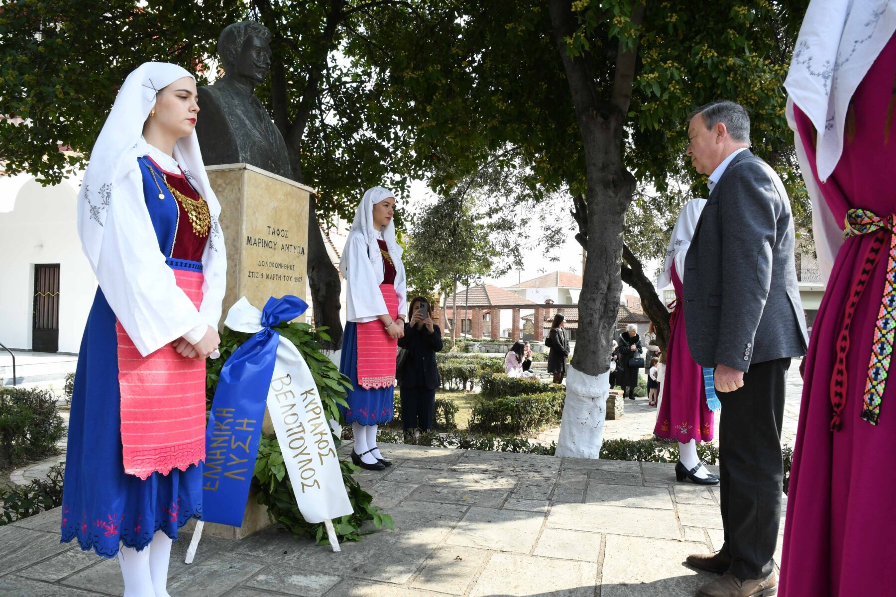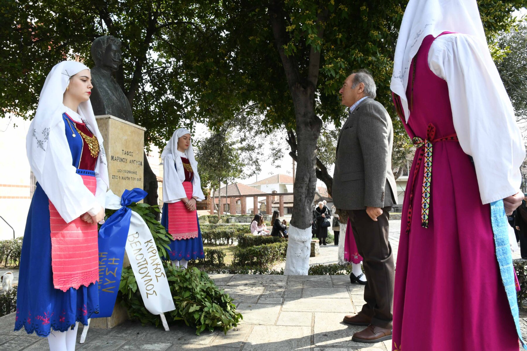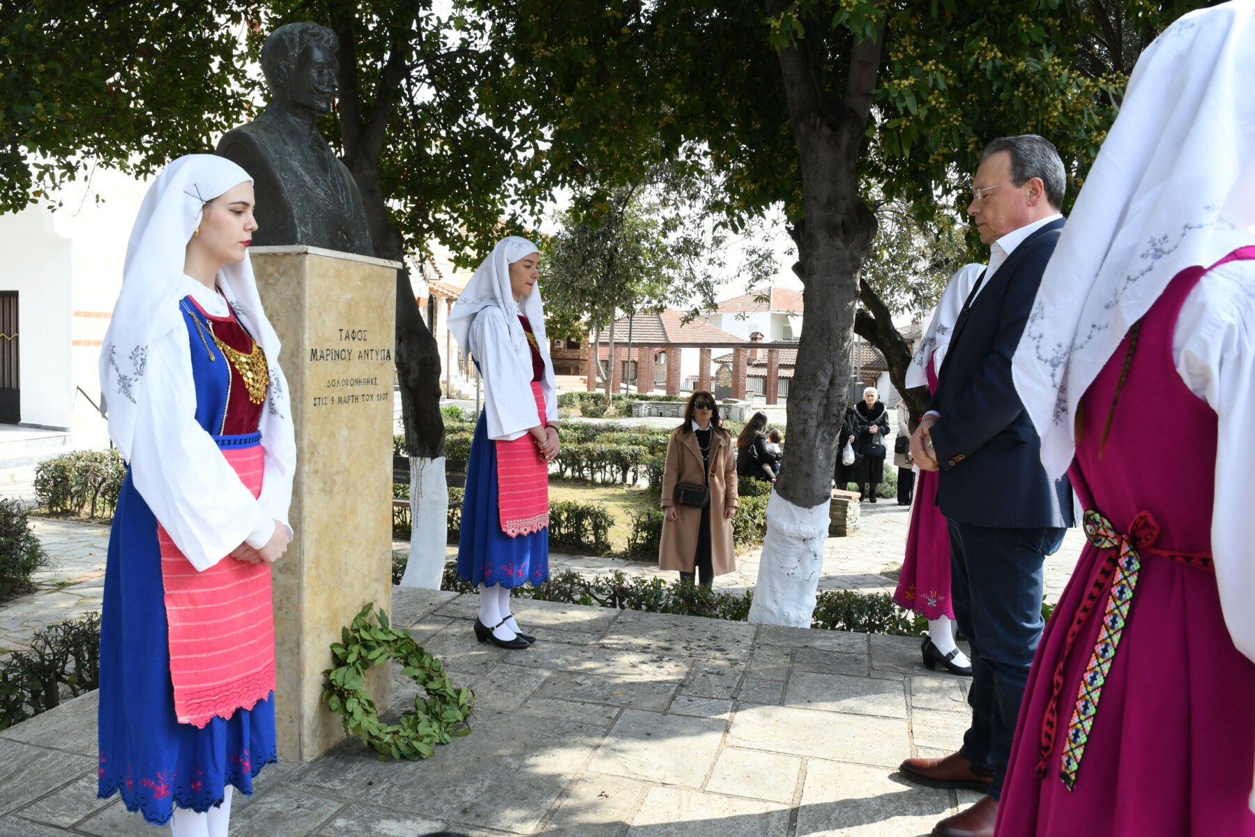 Προηγουμένως εψάλη επιμνημόσυνη δέηση από τον ιερέα π. Νεόφυτο, κρατήθηκε ενός λεπτού σιγή, και κατατέθηκαν στεφάνια από τον κ. Φάμελλο, την κ. Λιακούλη, τον Τομεάρχη Αγροτικής Ανάπτυξης και Τροφίμων της «Ελληνικής Λύσης – Κυριάκος Βελόπουλος», Καθηγητή Δενδροκομίας και πρόεδρο του Τμήματος Γεωπονίας – Αγροτεχνολογίας του Πανεπιστημίου Θεσσαλίας, κ. Παπαχατζή Αλέξανδρο, την αντιπεριφερειάρχη Εθελοντισμού και Πρόνοιας, Ανδριάνα Κομήτσα – Μπανταλού, τον κ. Γκουντάρα, την κ. Κρυσταλλία Μακαντάση – Γκατζώνα για την Εθνική Αντίσταση, την κ. Παλάκα, από τον πρόεδρο του Πολιτιστικού Μορφωτικού Συλλόγου Ομολίου «Μαρίνος Αντύπας», Παναγιώτη Αποστόλου, τον πρόεδρο του τοπικού Δασικού Συνεταιρισμού, Γεώργιο Εμμανουήλ, τον αντιπρόεδρο του Νέου Αγροτικού Συνεταιρισμού Ομολίου, Κωνσταντίνο Μυλωνά, και από την πρόεδρο του Συλλόγου Φίλων Μουσείου Εθνικής Αντίστασης Λάρισας, Αικατερίνη Εμμανουήλ.