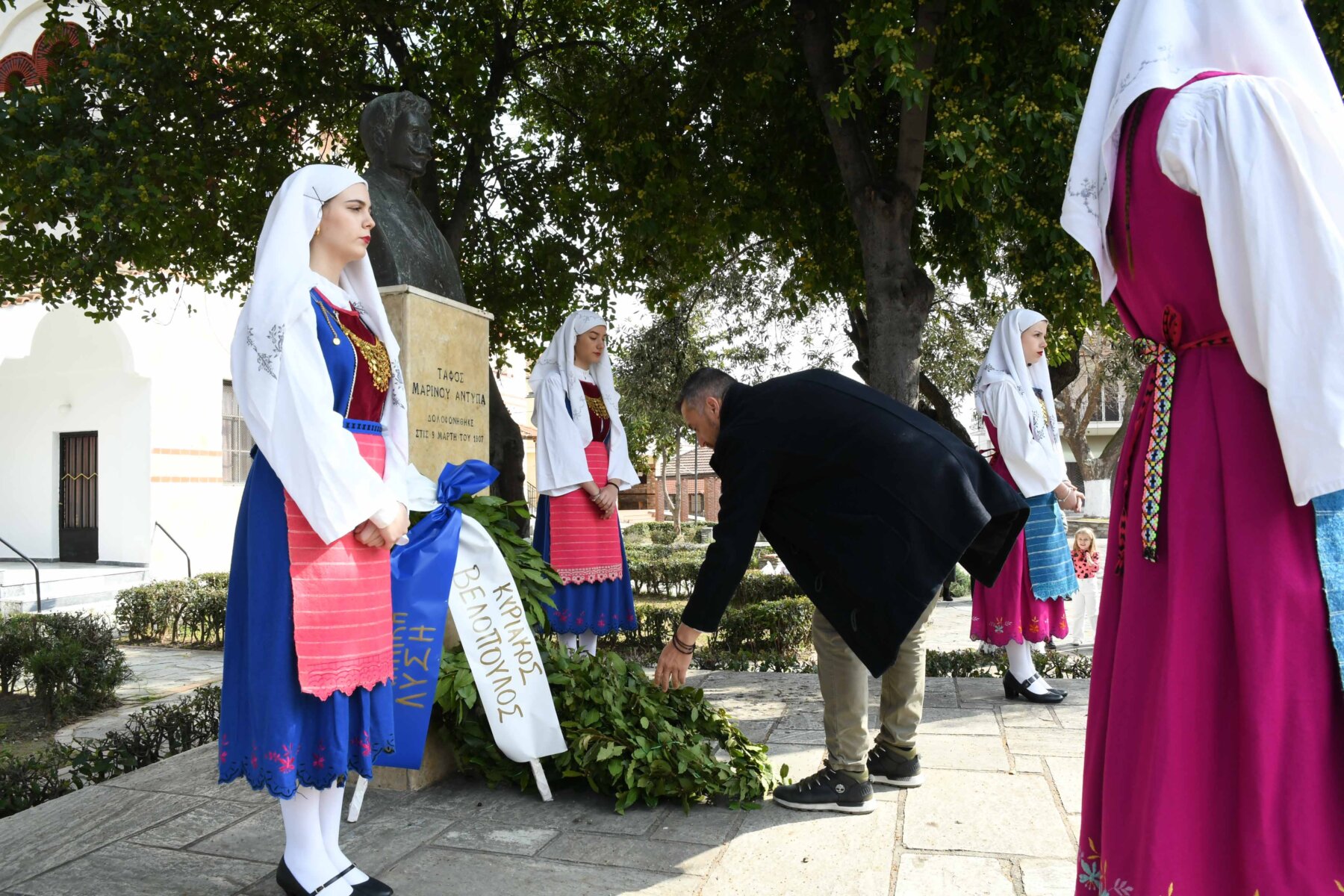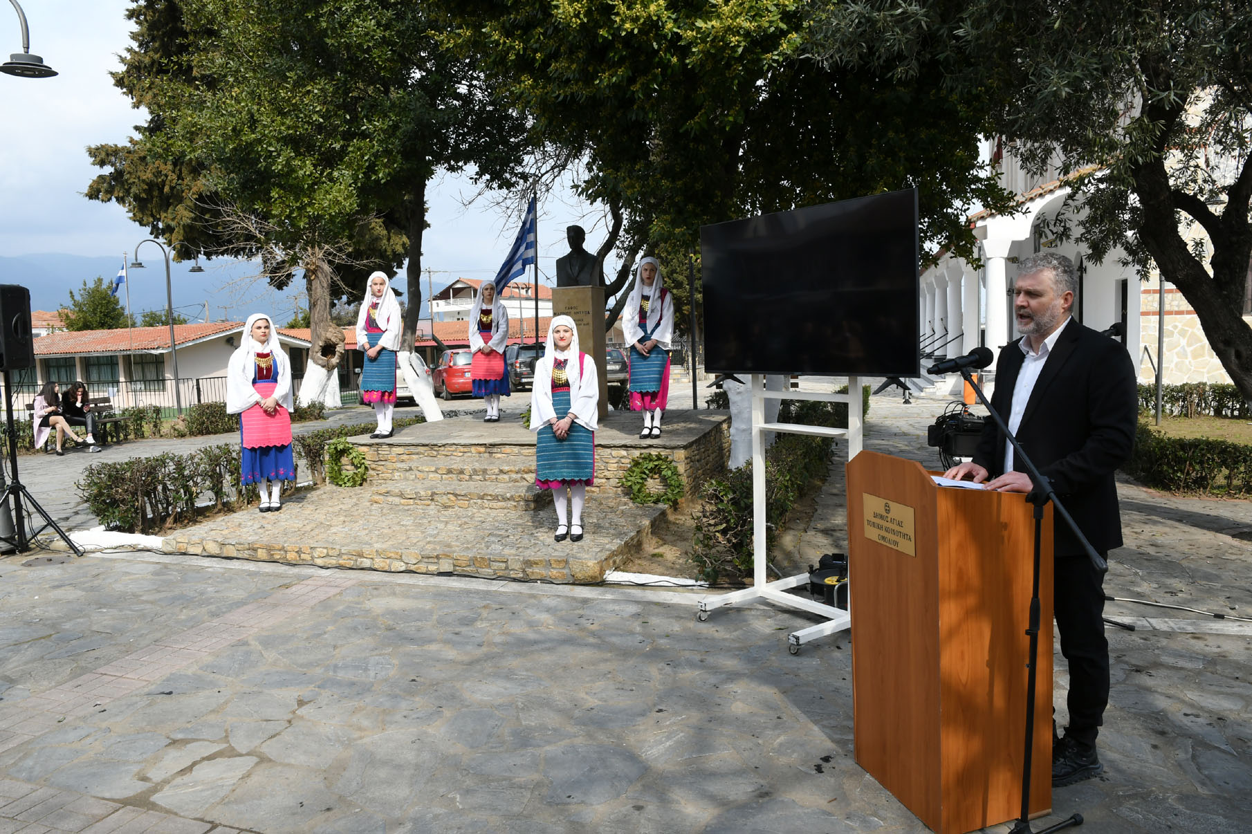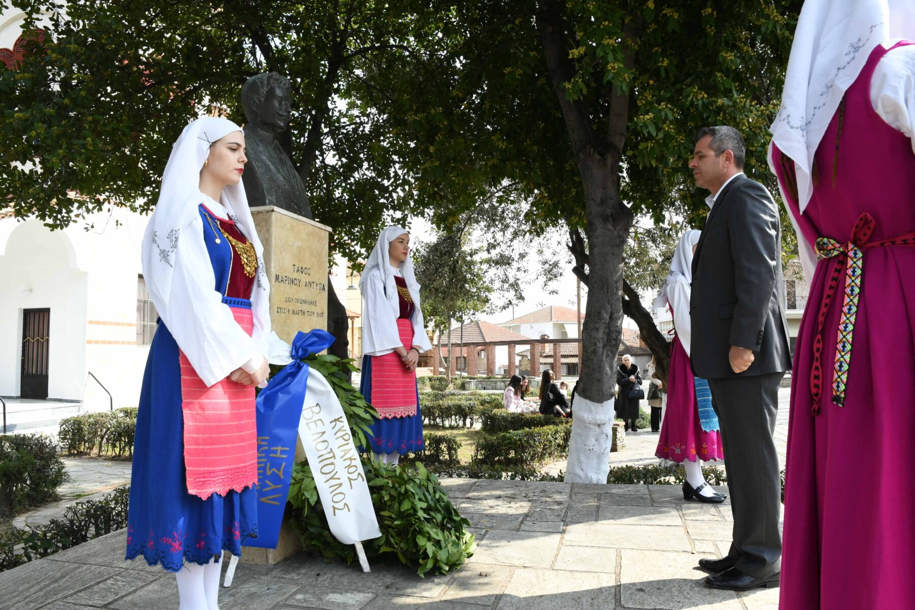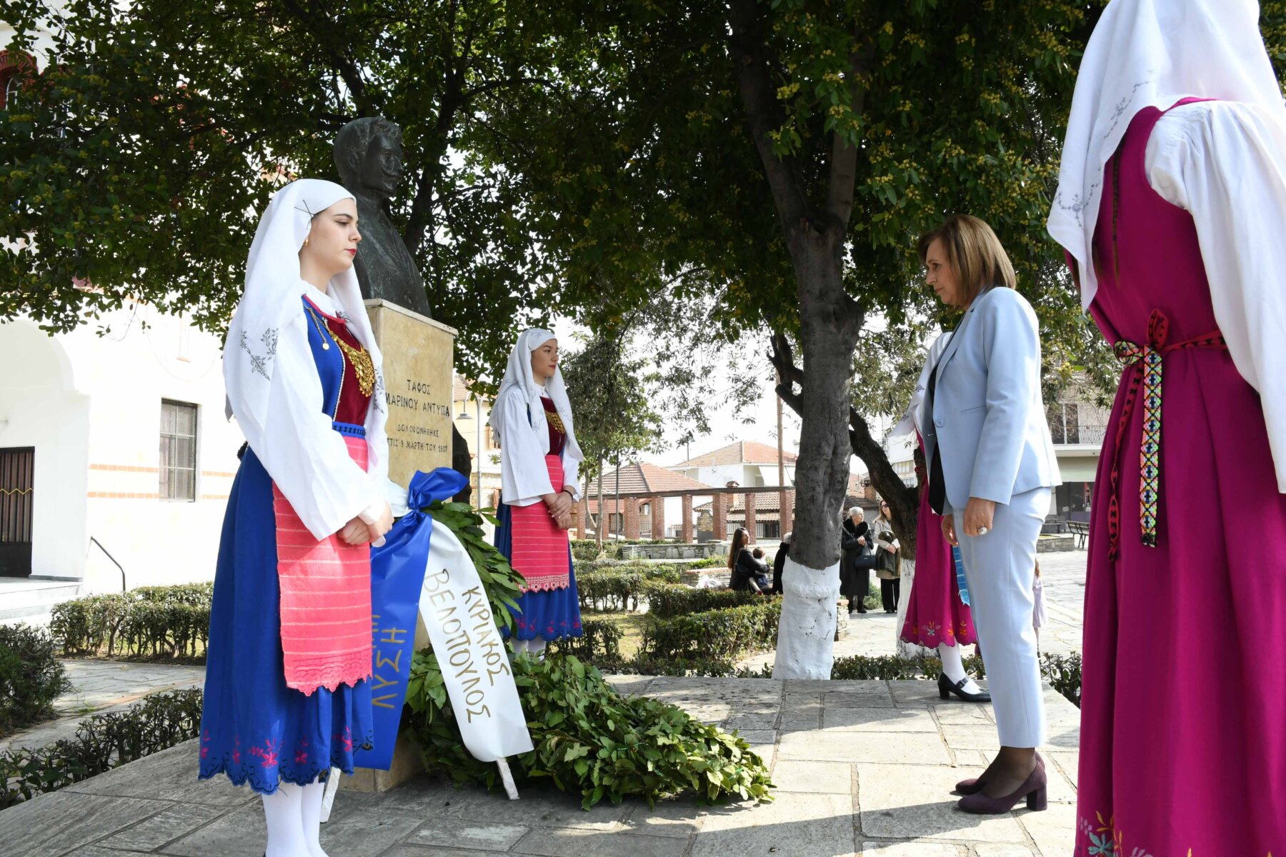 Προηγουμένως εψάλη επιμνημόσυνη δέηση από τον ιερέα π. Νεόφυτο, κρατήθηκε ενός λεπτού σιγή, και κατατέθηκαν στεφάνια από τον κ. Φάμελλο, την κ. Λιακούλη, τον Τομεάρχη Αγροτικής Ανάπτυξης και Τροφίμων της «Ελληνικής Λύσης – Κυριάκος Βελόπουλος», Καθηγητή Δενδροκομίας και πρόεδρο του Τμήματος Γεωπονίας – Αγροτεχνολογίας του Πανεπιστημίου Θεσσαλίας, κ. Παπαχατζή Αλέξανδρο, την αντιπεριφερειάρχη Εθελοντισμού και Πρόνοιας, Ανδριάνα Κομήτσα – Μπανταλού, τον κ. Γκουντάρα, την κ. Κρυσταλλία Μακαντάση – Γκατζώνα για την Εθνική Αντίσταση, την κ. Παλάκα, από τον πρόεδρο του Πολιτιστικού Μορφωτικού Συλλόγου Ομολίου «Μαρίνος Αντύπας», Παναγιώτη Αποστόλου, τον πρόεδρο του τοπικού Δασικού Συνεταιρισμού, Γεώργιο Εμμανουήλ, τον αντιπρόεδρο του Νέου Αγροτικού Συνεταιρισμού Ομολίου, Κωνσταντίνο Μυλωνά, και από την πρόεδρο του Συλλόγου Φίλων Μουσείου Εθνικής Αντίστασης Λάρισας, Αικατερίνη Εμμανουήλ.