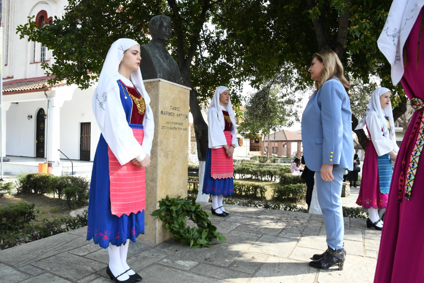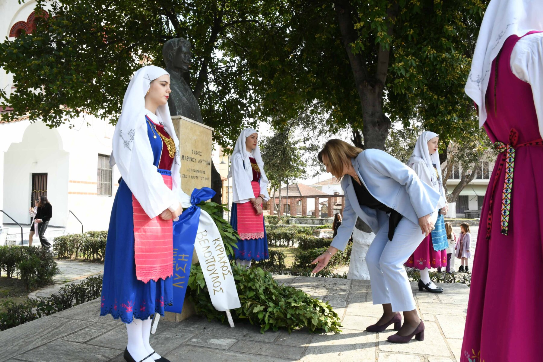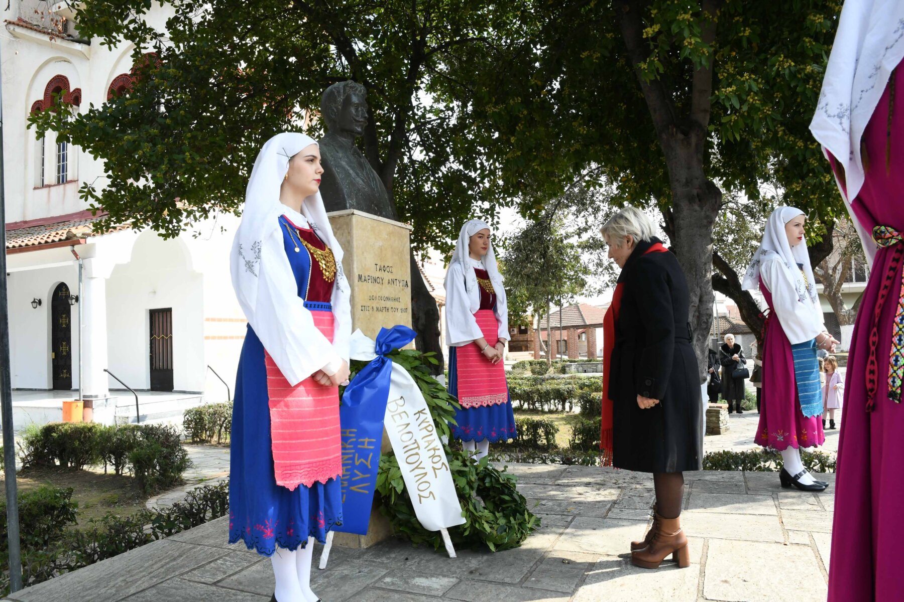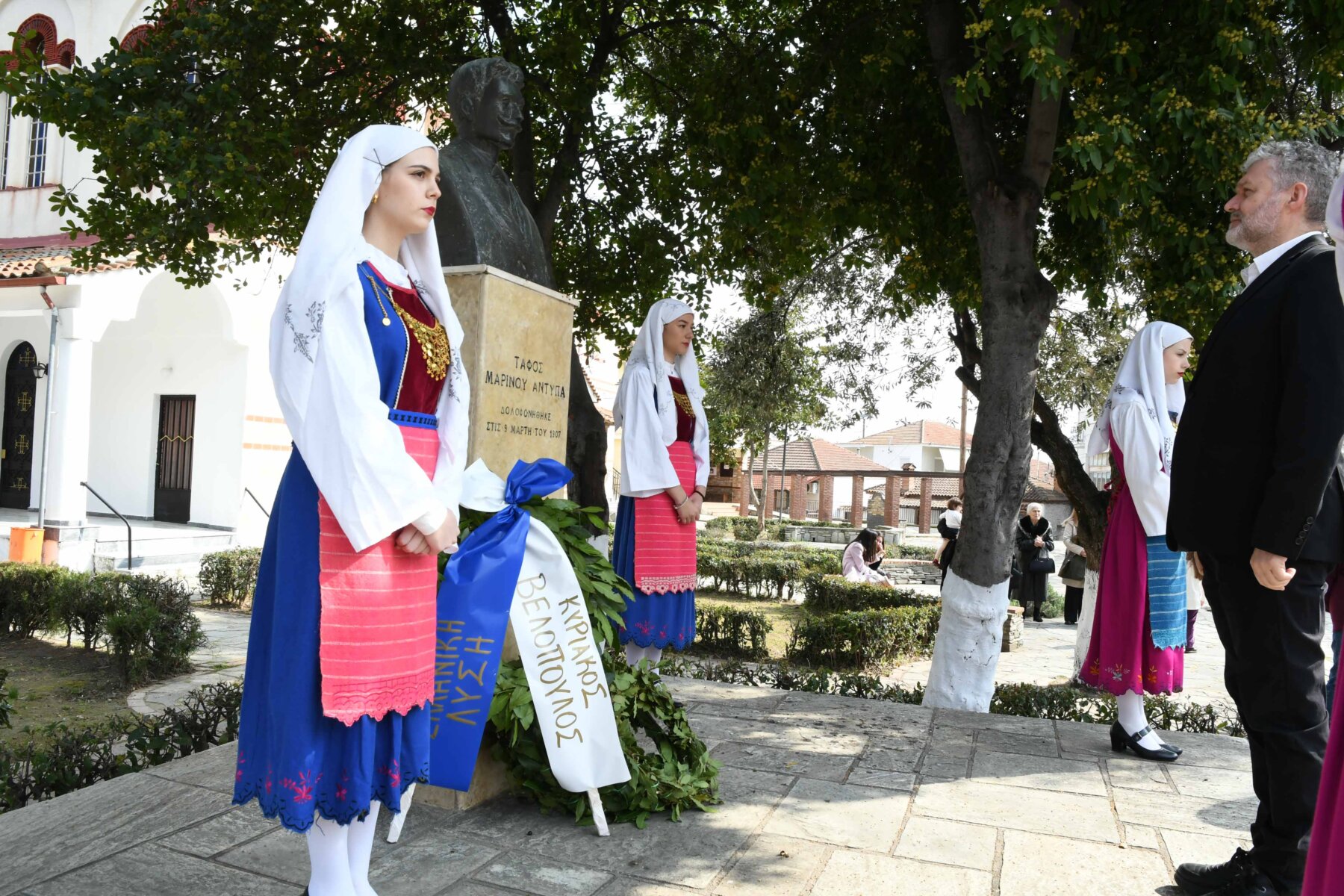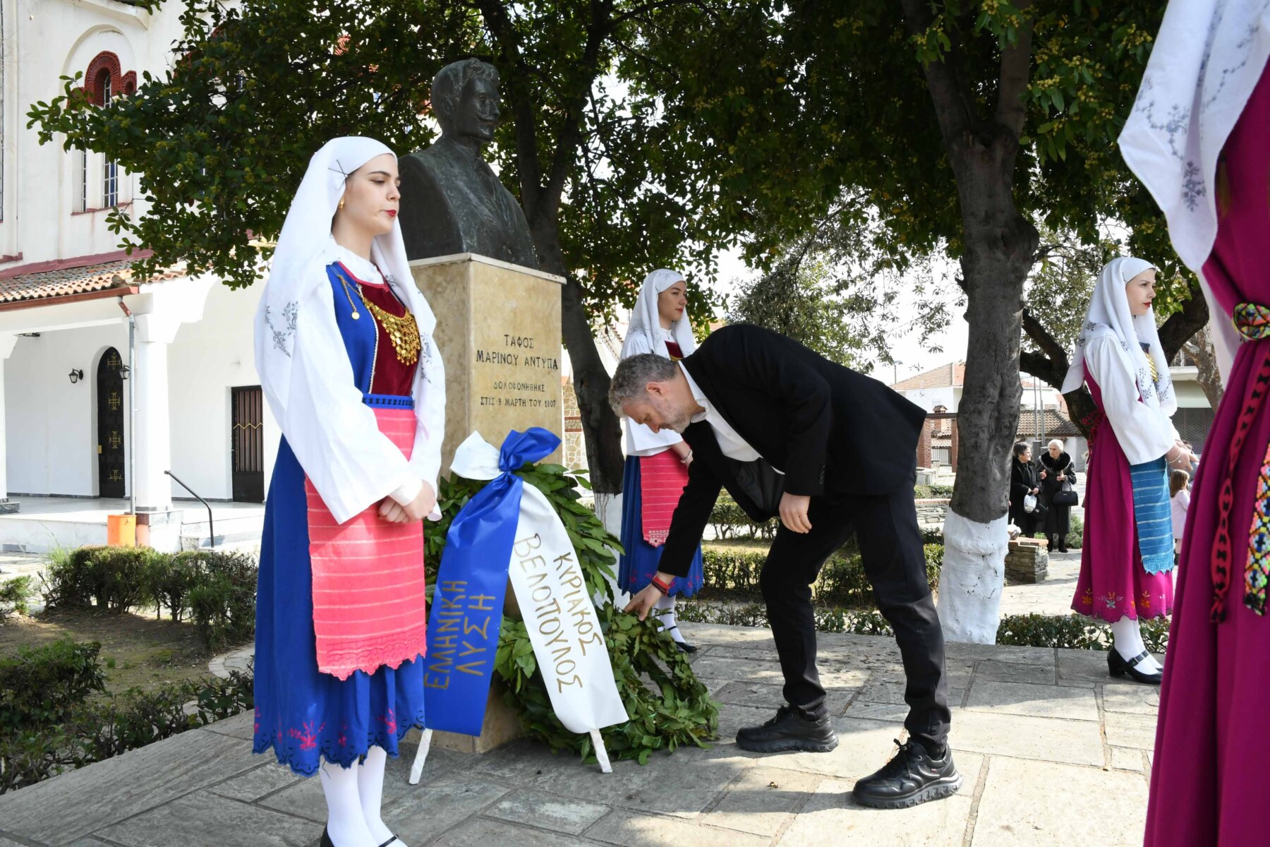 Προηγουμένως εψάλη επιμνημόσυνη δέηση από τον ιερέα π. Νεόφυτο, κρατήθηκε ενός λεπτού σιγή, και κατατέθηκαν στεφάνια από τον κ. Φάμελλο, την κ. Λιακούλη, τον Τομεάρχη Αγροτικής Ανάπτυξης και Τροφίμων της «Ελληνικής Λύσης – Κυριάκος Βελόπουλος», Καθηγητή Δενδροκομίας και πρόεδρο του Τμήματος Γεωπονίας – Αγροτεχνολογίας του Πανεπιστημίου Θεσσαλίας, κ. Παπαχατζή Αλέξανδρο, την αντιπεριφερειάρχη Εθελοντισμού και Πρόνοιας, Ανδριάνα Κομήτσα – Μπανταλού, τον κ. Γκουντάρα, την κ. Κρυσταλλία Μακαντάση – Γκατζώνα για την Εθνική Αντίσταση, την κ. Παλάκα, από τον πρόεδρο του Πολιτιστικού Μορφωτικού Συλλόγου Ομολίου «Μαρίνος Αντύπας», Παναγιώτη Αποστόλου, τον πρόεδρο του τοπικού Δασικού Συνεταιρισμού, Γεώργιο Εμμανουήλ, τον αντιπρόεδρο του Νέου Αγροτικού Συνεταιρισμού Ομολίου, Κωνσταντίνο Μυλωνά, και από την πρόεδρο του Συλλόγου Φίλων Μουσείου Εθνικής Αντίστασης Λάρισας, Αικατερίνη Εμμανουήλ.