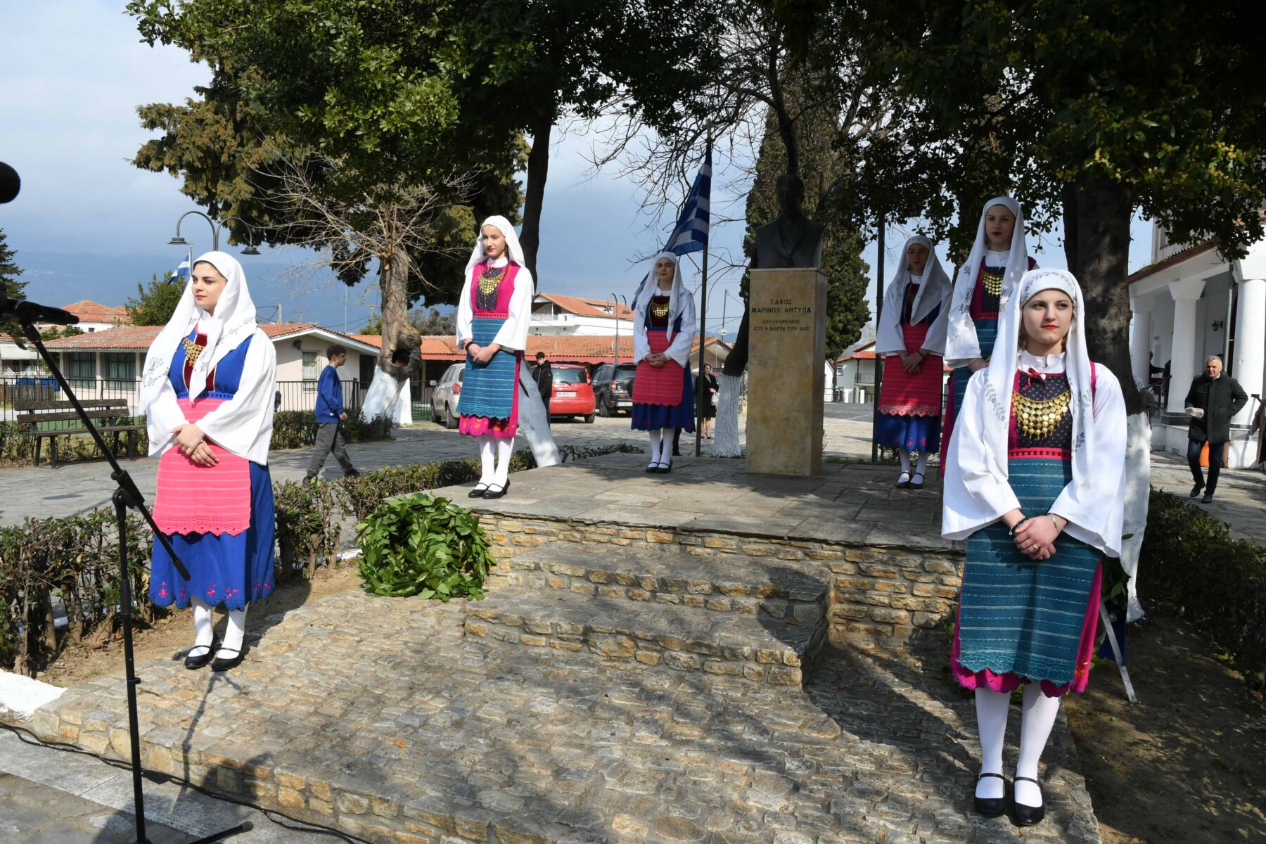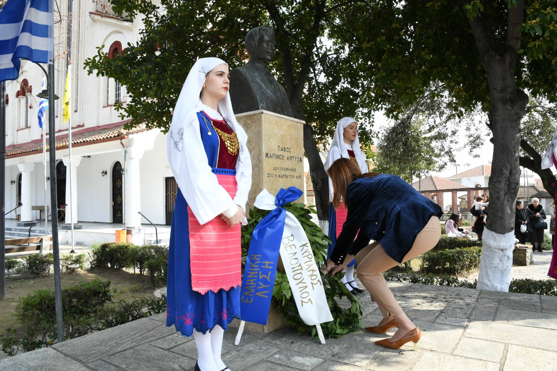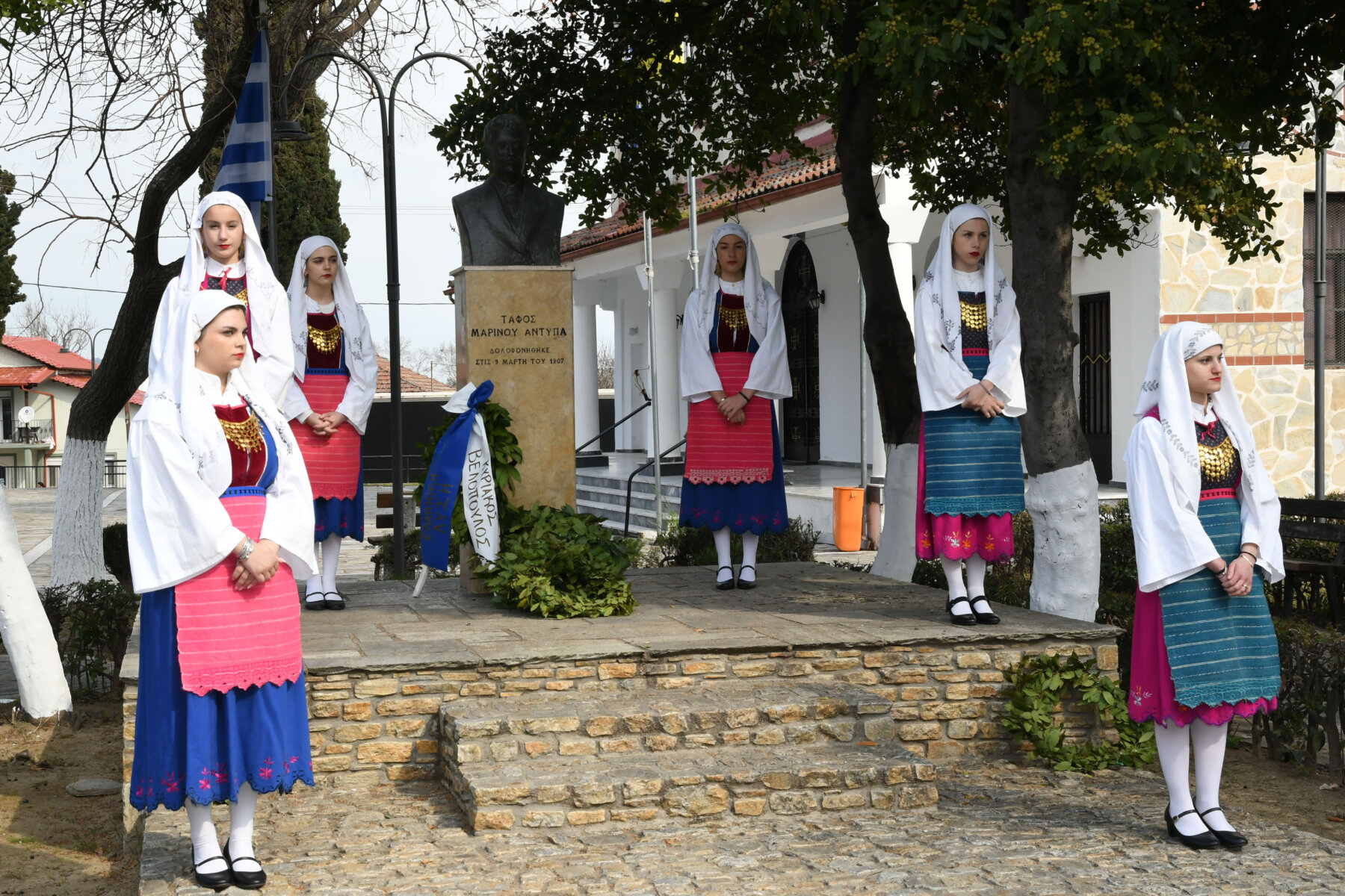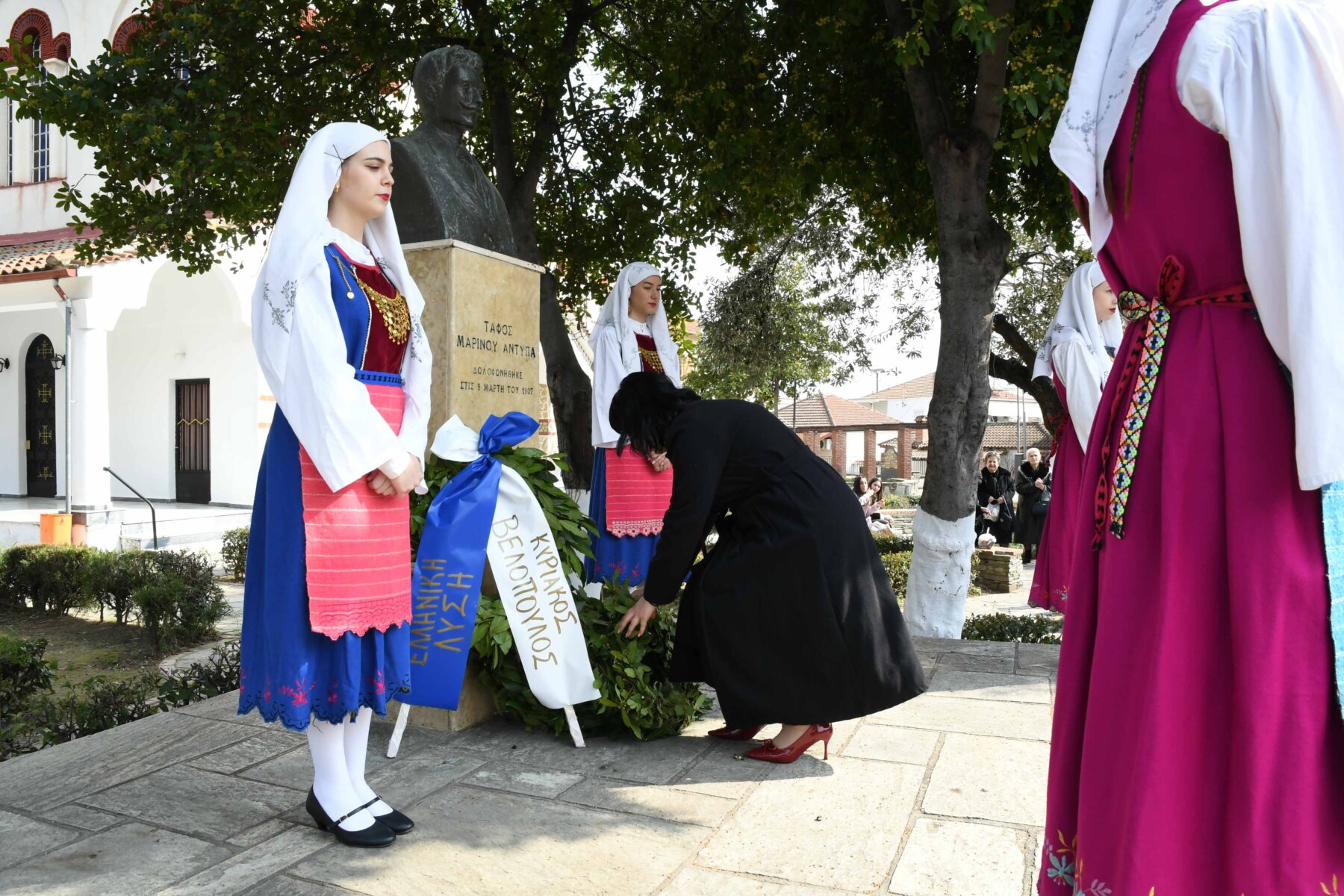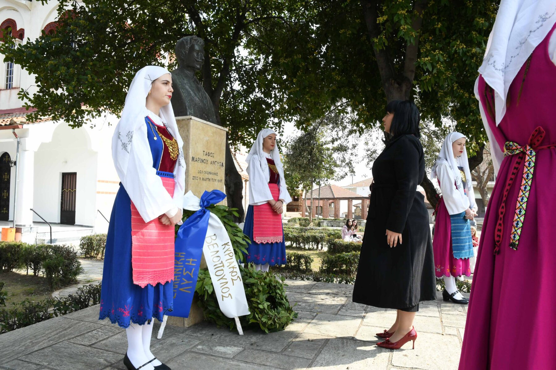 Προηγουμένως εψάλη επιμνημόσυνη δέηση από τον ιερέα π. Νεόφυτο, κρατήθηκε ενός λεπτού σιγή, και κατατέθηκαν στεφάνια από τον κ. Φάμελλο, την κ. Λιακούλη, τον Τομεάρχη Αγροτικής Ανάπτυξης και Τροφίμων της «Ελληνικής Λύσης – Κυριάκος Βελόπουλος», Καθηγητή Δενδροκομίας και πρόεδρο του Τμήματος Γεωπονίας – Αγροτεχνολογίας του Πανεπιστημίου Θεσσαλίας, κ. Παπαχατζή Αλέξανδρο, την αντιπεριφερειάρχη Εθελοντισμού και Πρόνοιας, Ανδριάνα Κομήτσα – Μπανταλού, τον κ. Γκουντάρα, την κ. Κρυσταλλία Μακαντάση – Γκατζώνα για την Εθνική Αντίσταση, την κ. Παλάκα, από τον πρόεδρο του Πολιτιστικού Μορφωτικού Συλλόγου Ομολίου «Μαρίνος Αντύπας», Παναγιώτη Αποστόλου, τον πρόεδρο του τοπικού Δασικού Συνεταιρισμού, Γεώργιο Εμμανουήλ, τον αντιπρόεδρο του Νέου Αγροτικού Συνεταιρισμού Ομολίου, Κωνσταντίνο Μυλωνά, και από την πρόεδρο του Συλλόγου Φίλων Μουσείου Εθνικής Αντίστασης Λάρισας, Αικατερίνη Εμμανουήλ.